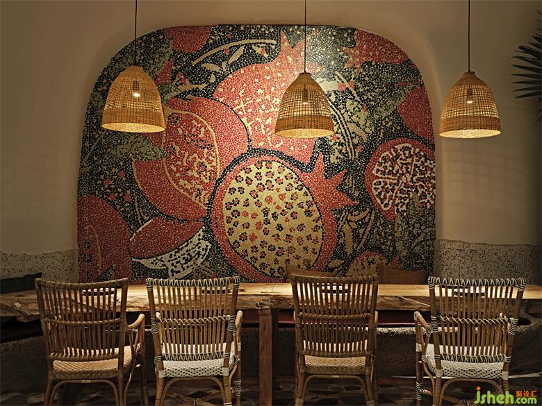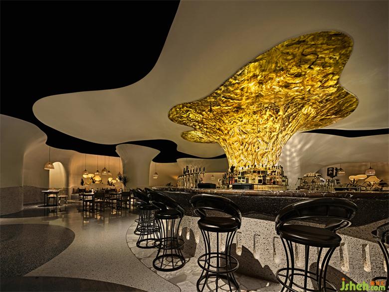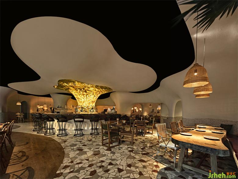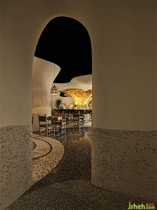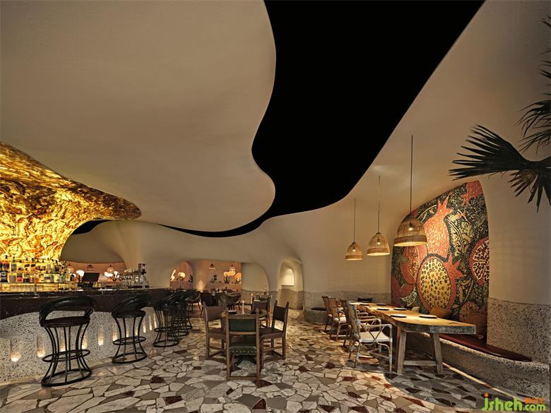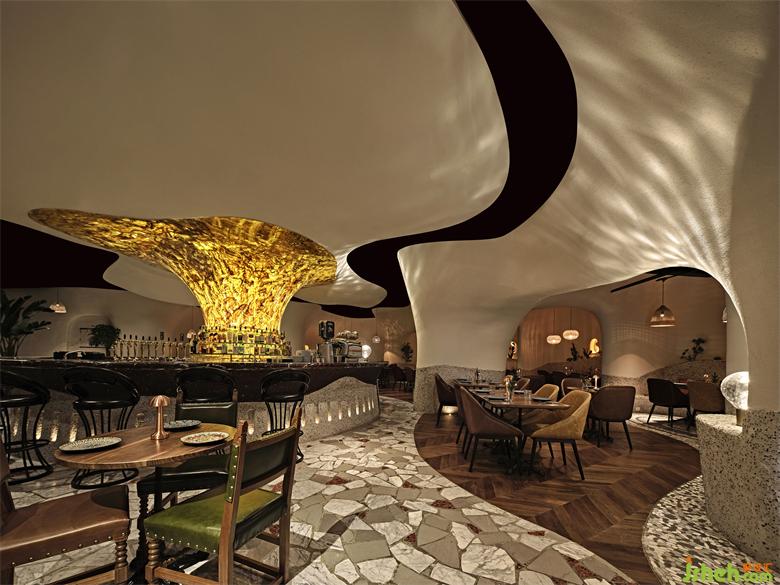 西班牙餐厅设计室内整体用餐区域以“海洋洞窟”的概念自然联结。不规则地柔软曲线将天花与地面相应地划分为不同区域,也由此让圆形围合成一个个大大小小的用餐区,自然地划分出不同的用餐体验,远古文明的意向,如洞穴、穹顶、壁画,被大量地置入空间之中,这样充满浓郁性地场域气质,也让落座的食客们产生微妙地情绪变化,进而放松下来,在点状光源制造的静谧氛围中,享受美食好酒与难得的欢聚时光。