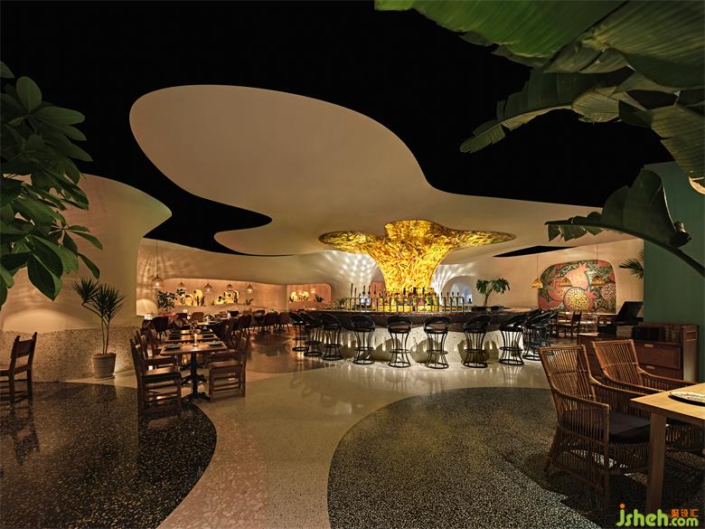 人们进入室内用餐区后,视觉中心自然会落在中央那联结“天地”的“生命之树” 上。这个位于不规则圆形吧台的柱状“树干”透露出琥珀的本色,枝干自然地伸展蔓延,在夜间更像是一株充满生命原力的火炬。围坐于这个支撑整体空间的能量聚点,无论把咖啡闲聊还是把酒言欢,交流围绕这个耀目的生命体下,仿佛回荡出了迷人的时光香气。