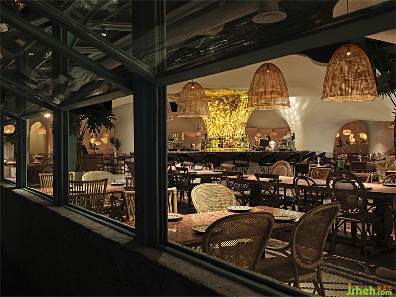 餐厅身处魔方商场之上,西班牙餐厅设计师用一段长廊帮助人们完成情绪的转换,从零售空间抵达建筑顶层的过程,也是从当代社会的喧嚣热闹去往远古引力场的过渡。从整体上分为室内开放用餐区,中央吧台区,周围卡座区,阳光长廊以及一个露天花园用餐区。