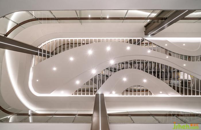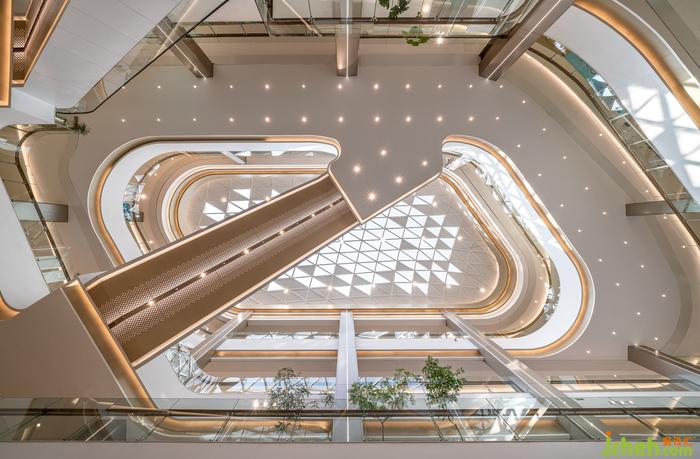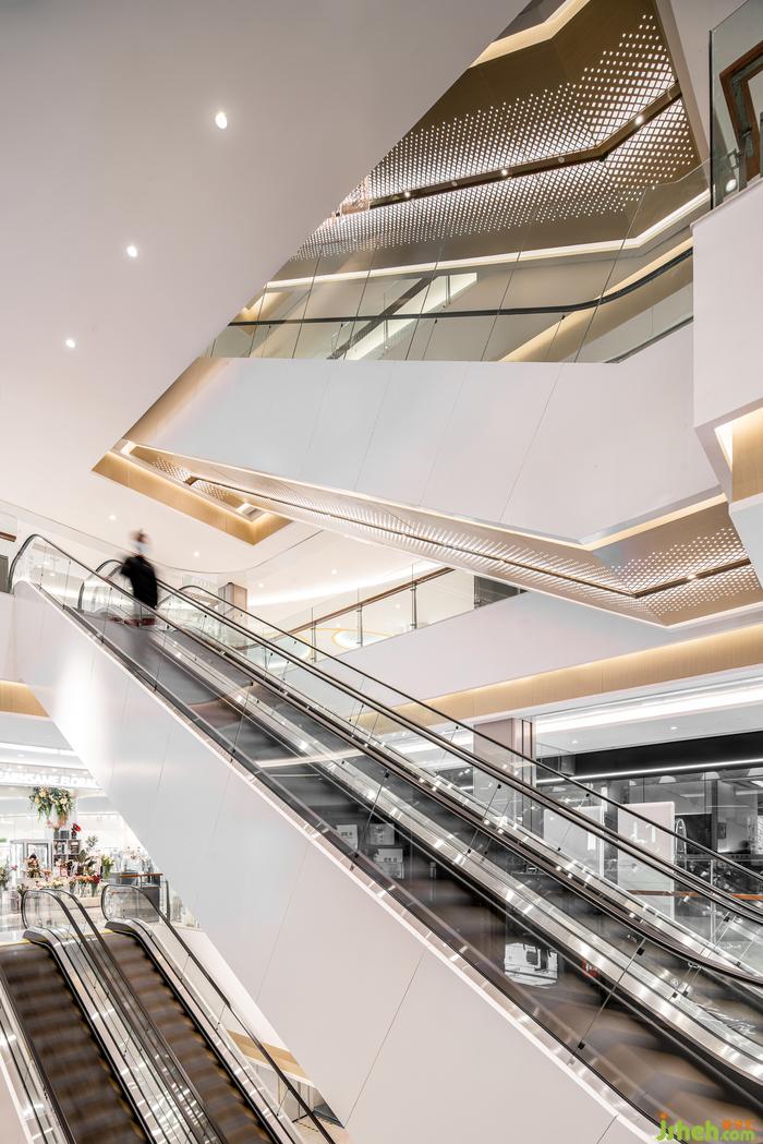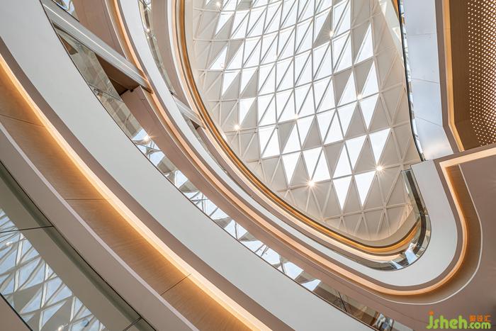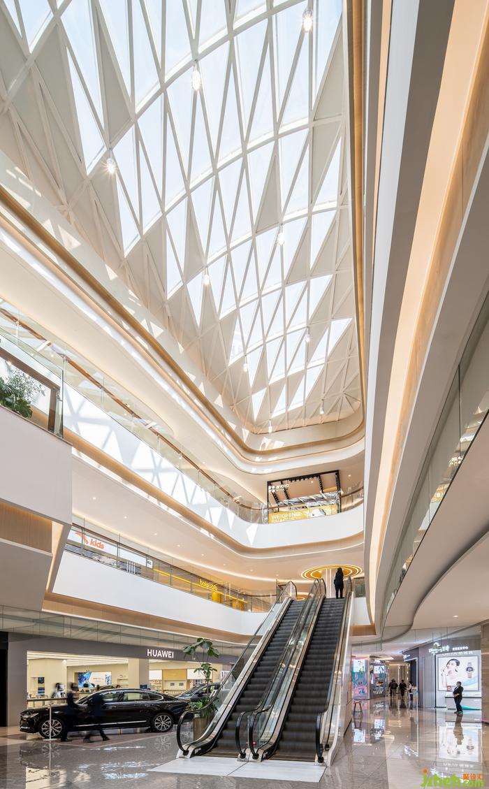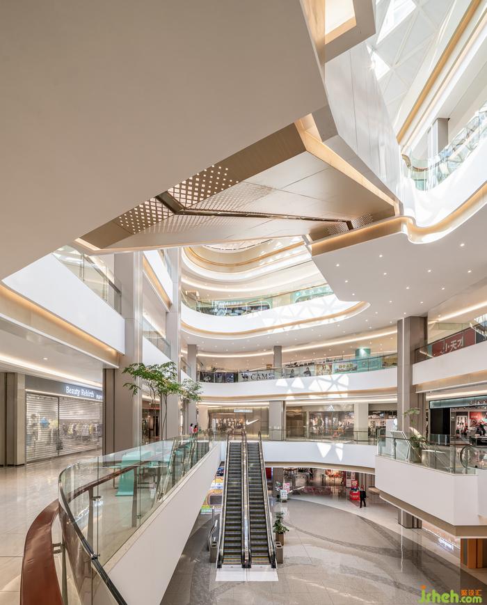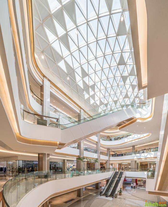 在最大的中庭处,设计师打开一楼地面,让负一楼融入中庭。高度的延伸,购物中心设计让中庭空间豁然开朗;自然采光倾斜而下,让整个空间都能自由呼吸。