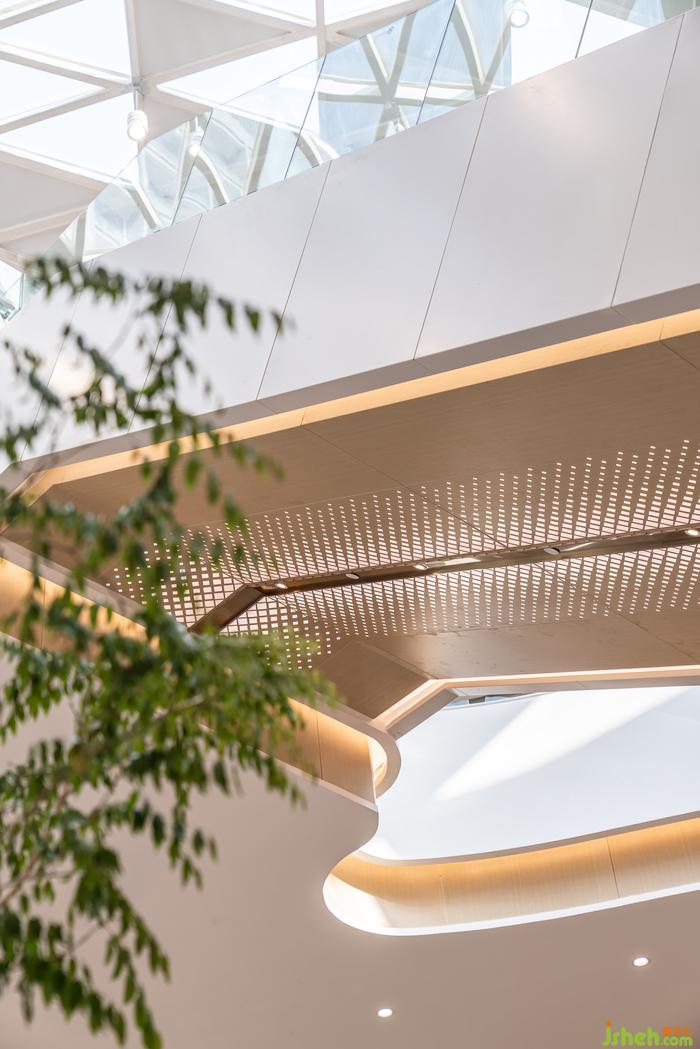 中庭天花采用艺术镂空铝板,购物中心设计以几何图形拼接而成,带来结构的美感;阳光照耀在散漫分布的绿树上,焕发出勃勃生机;光影随着时间起舞,喜悦油然而生。