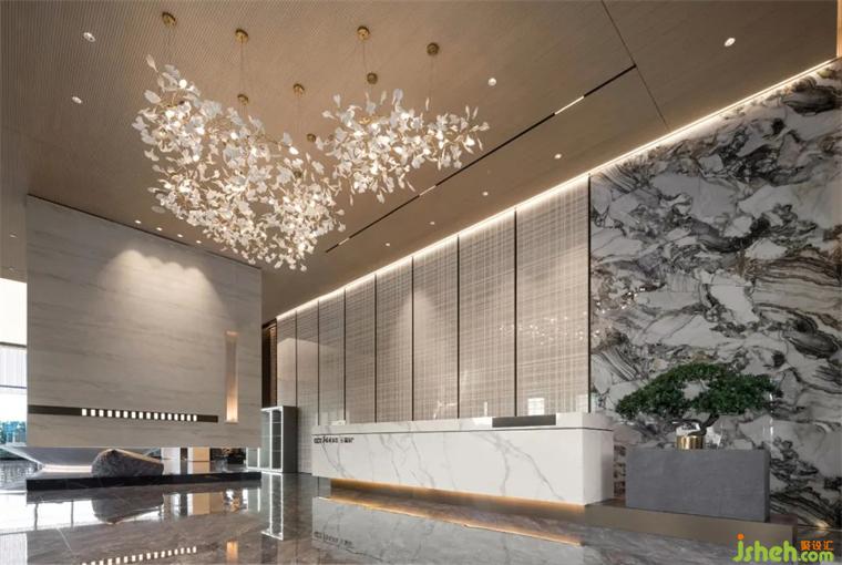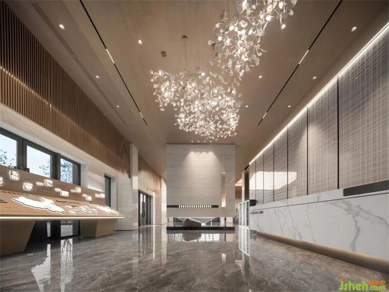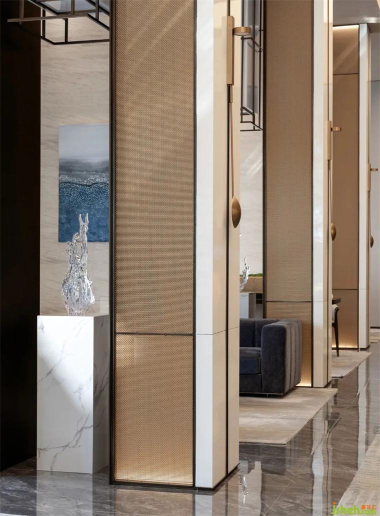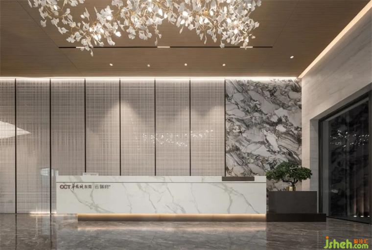 销售中心入口处,大型装饰吊灯讲述着《香飘四季》春天的故事,花团锦簇的古梅暗香浮动,呼应着麻涌的风物特征,也牵引着人们对美好生活的向往。它与接待台的天然水墨石纹背景,恍若某种诗意的隐喻,让美不止于表面,也成为充盈内心的力量。
