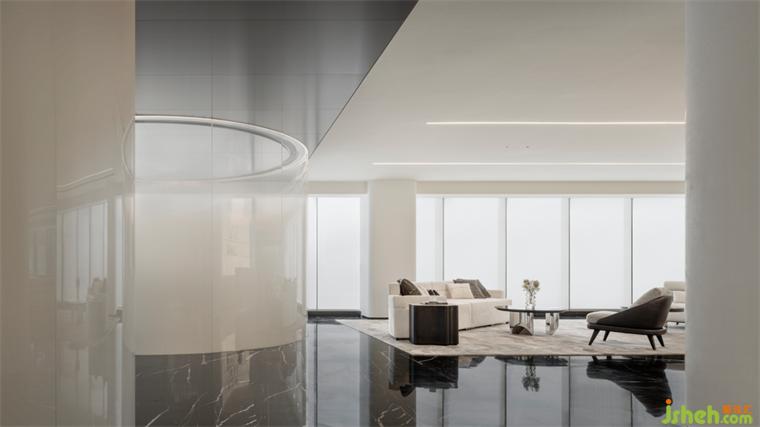 弧度家具顺滑的线条与金属质感的室内线条相互呼应,创造出硬朗与松弛之感。展示中心设计曲线构造的沙发具有流动的质感,和抚慰人心的魔力,不仅提升了整体布局的艺术表现力,也让人们得到视觉和心理的放松与归属。