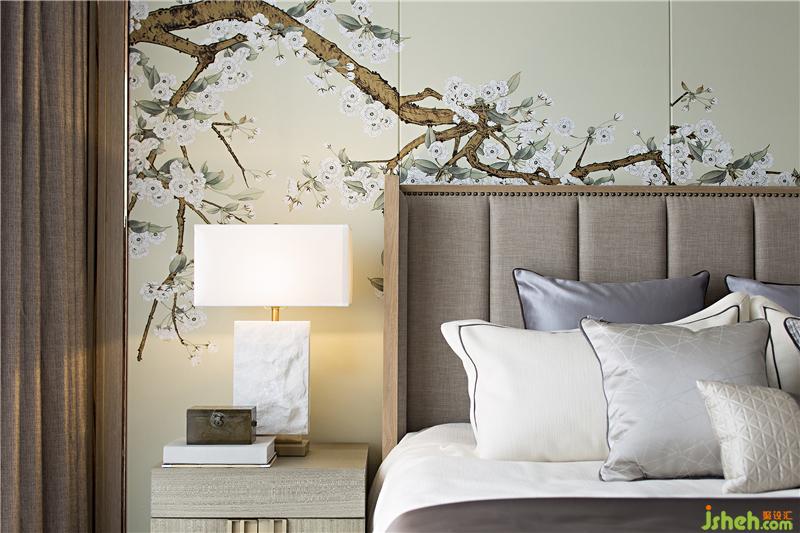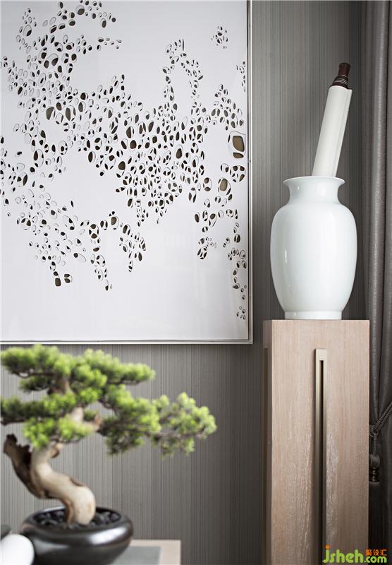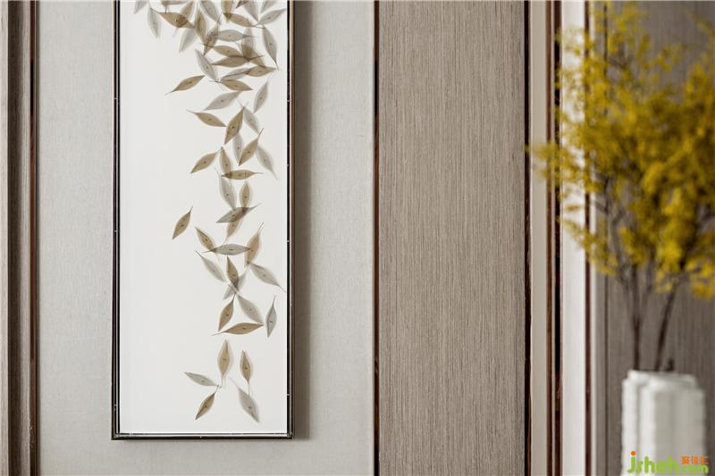 浅木色色系为主,荼白、黛绿、绯红的元素点缀其中,视觉上颜色高度和谐,一种低调却不失讲究的精致感悄然流露。设计师以传统的艺术脉络,样板房设计通过细节串联了整个视觉空间。