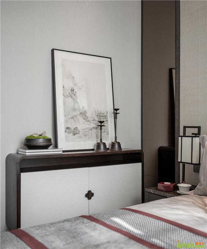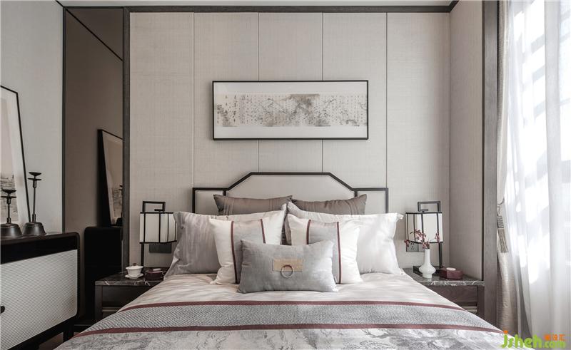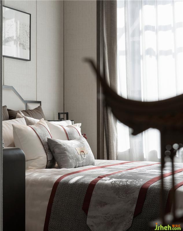 卧室在色彩方面秉承了传统古典风格的典雅和华贵,样板房设计在配饰的选择方面更为简洁,更加流畅地表达出传统文化中的精髓。为了给增添几分暖意,饰以精巧的灯具和雅致的挂画,使整个空间在浓浓古韵中渗透了几许现代气息。
