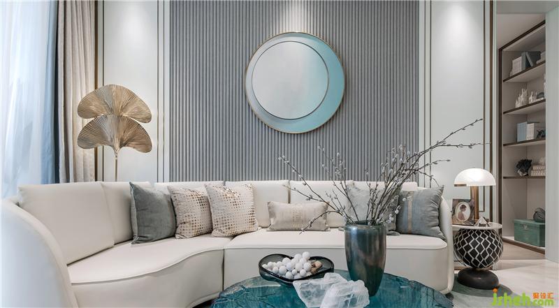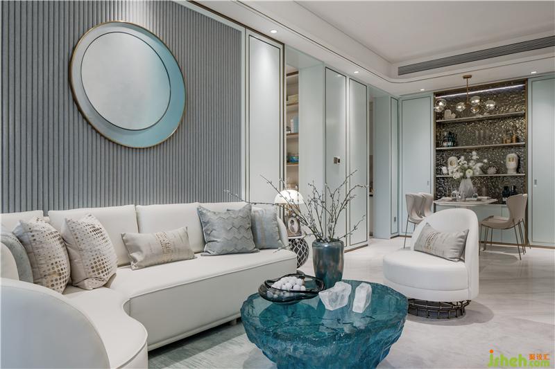从玄关转入客厅,浪漫感、幸福感扑面而来,灰白底色的柔和调性,被蒂芙尼蓝星星点缀着,令人眼前一亮,放松身心。这种现代简约的构造,勾勒出一个精致优雅的蓝色风情家,让人身处繁华的闹市中,心情也能平静舒畅。
