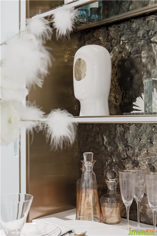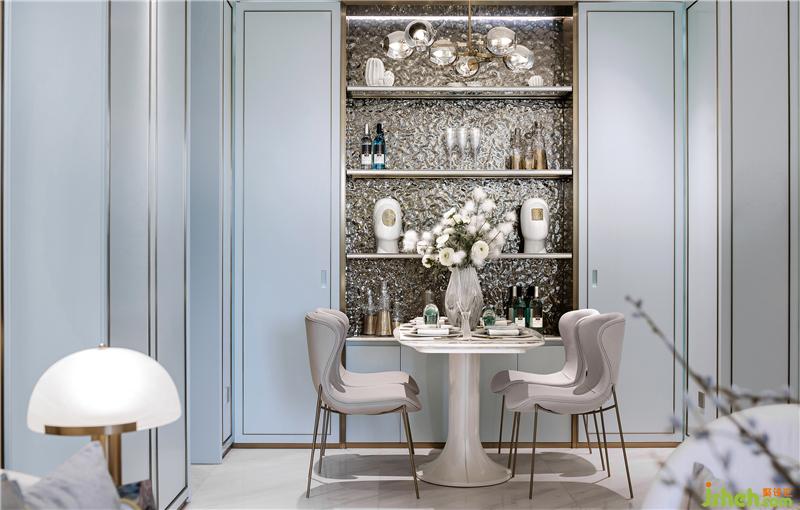 餐厅同样采取蒂芙尼蓝为主体色,金属质感的壁柜扩大储物可能性。色彩承载的真正意义,是平凡生活中的惊喜,是对幸福生活的向往。在精致餐具的烘托下,惹人放慢脚步,与家人同享浪漫的用餐时光。杯盏间深情浅笑,微醺时促膝长谈,无关风雨,乐享当下。光与美,热烈与浪漫、温暖与幸福、璀璨与永恒在这里绽放。