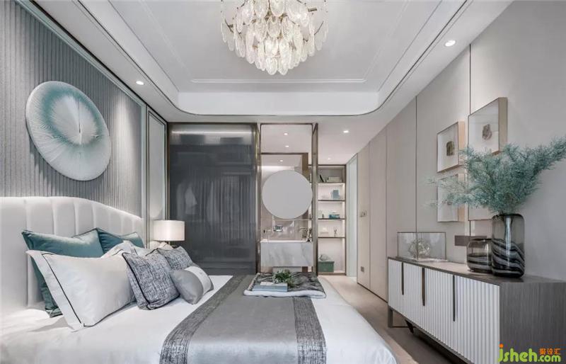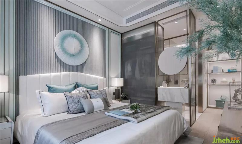 卧室是人们心所归处。主卧利用步入式衣帽及展示柜。开放式主卧卫生间、衣帽间、女主人的化妆台交叉功能,样板房设计面积配比不再是局限。蒂芙尼蓝柔和的色彩提升幸福感和归属感。时尚与美学在其中跳跃,惊起一丝慵懒与惬意的波澜,又平添一份惊鸿一瞥的包容。