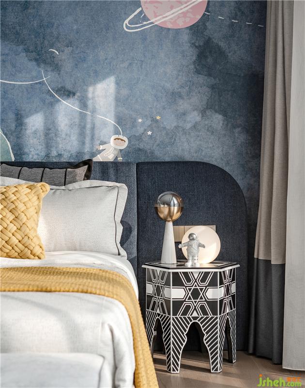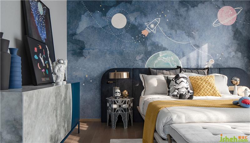 儿童房宇宙主题的空间语调融入丰富设计词汇,样板间设计装置艺术品的植入,为整体空间设计增添了奇趣气息,创造了感官的丰富度的同时,让空间氛围达到活泼可爱的气氛。