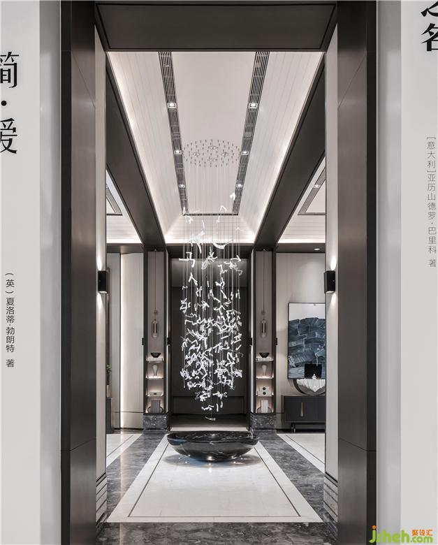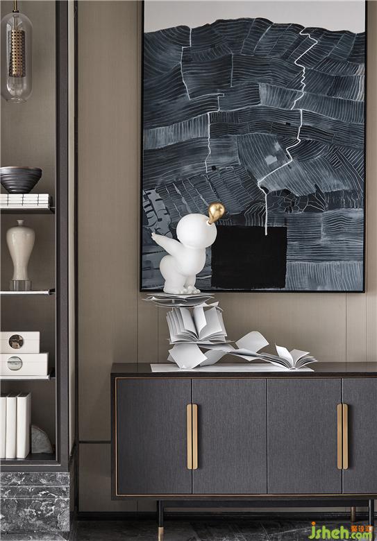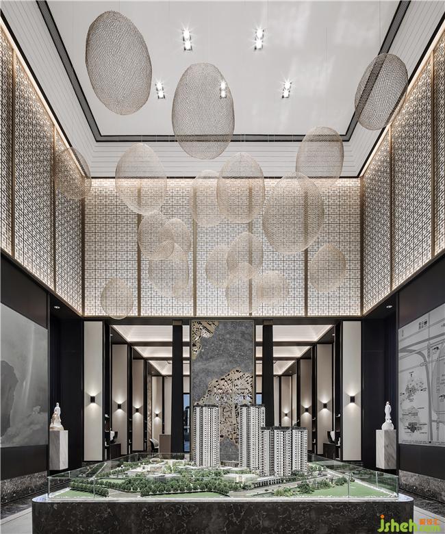 Copper color irregular metal ball suspended in the air, translucent three-dimensional sense to break the Chinese symmetry of the heavy. The whole picture has distinct layers, youdao radius, and the upper and lower partition mode makes the high lift not empty, using the Chinese style window lattice design with metal texture, gorgeous but elegant.