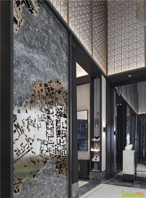 剥离斑驳的大理石,透出破碎金片,用不规则的线条打造出一种流动感,售楼处设计打破空间的呆板,寓静于动。