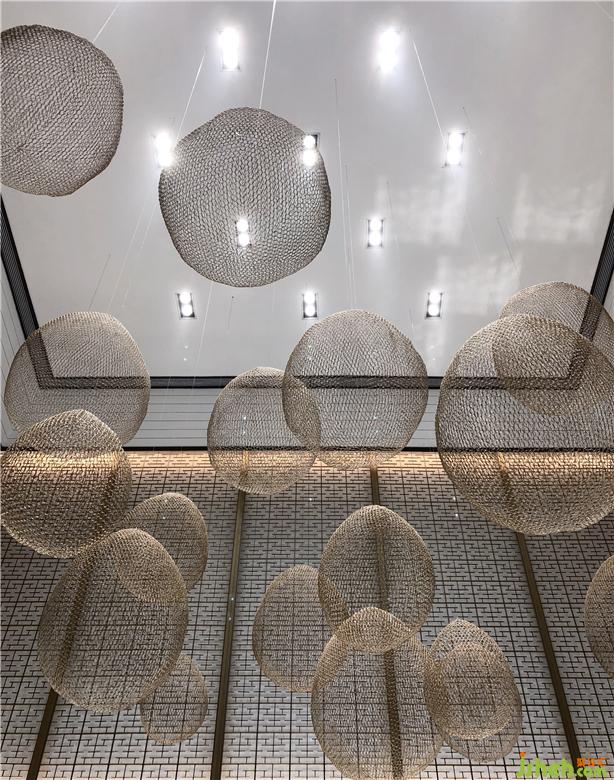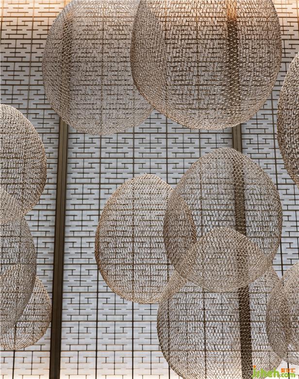 铜色不规则金属球悬于半空,半透明的立体感打破中式的对称的厚重感。整个画面层次分明,方圆有道,上下隔断的方式使得极高的挑高不至于空洞,采用金属质感的中式窗棂图案,华丽却不失典雅。