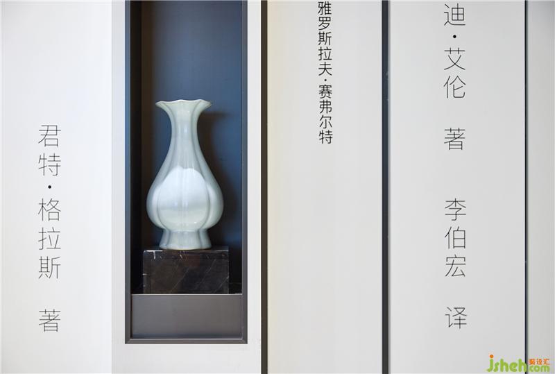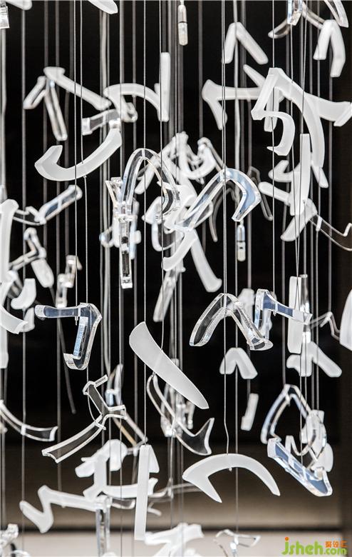 售楼处设计以书的厚薄高低无序排开,堆砌成墙体,有中式的无声《呐喊》,也有西式的“静默如迷”,纸张纷飞,笔划垂如丝绦。就像把书桌放大100倍,人如蝼蚁,一道窄门开启学海无涯的人生。