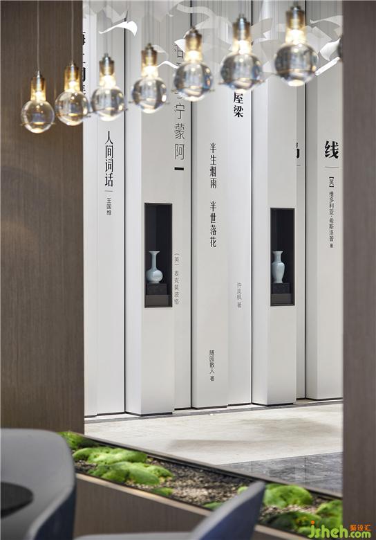 远看成岭侧看成峰,设计师对于景物的大小角度和距离构图也要了然于胸。透过灯帘,书的大小仿佛伸手可得,就想席地而坐,添香煮茶,徜徉书海。
