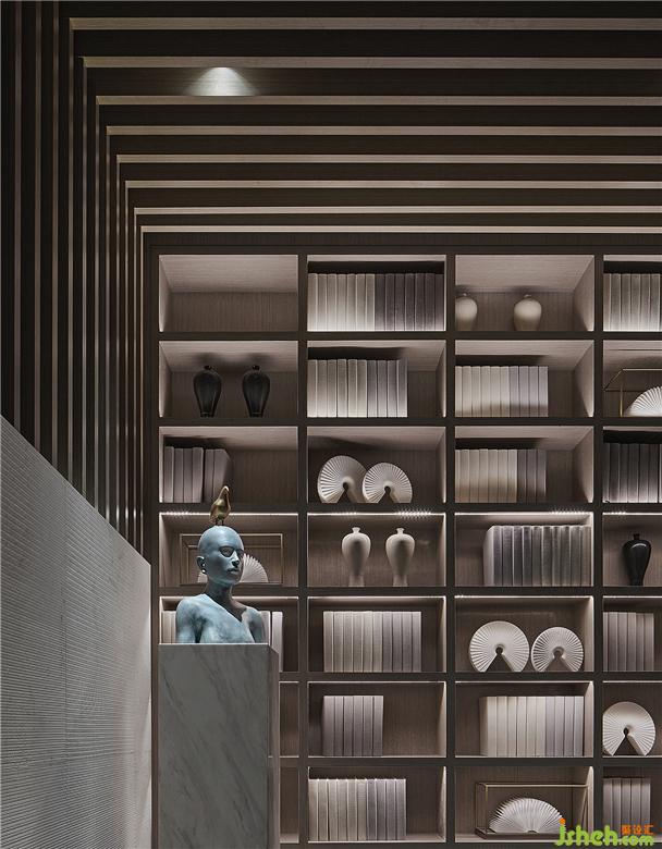A shadow is born of light and goes with it. The top and the wall are made of wooden stripboards, dividing a single lamp into several dark alternate stripboards, which expand the spatial hierarchy and depth. And each case bookcase USES the lamplight from bottom to top individually, form visual focus, thereby overall picture is primary and secondary distinct.