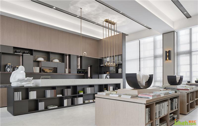 影因光而生,随光而逝。顶部和墙体采用木质条形隔板,将一盏孤灯分割成数个阴暗交替的条形画面,售楼处设计拓展空间层次感和纵深。而每格书柜采用单个从下往上的灯光,形成视觉焦点,从而总体画面主次分明。