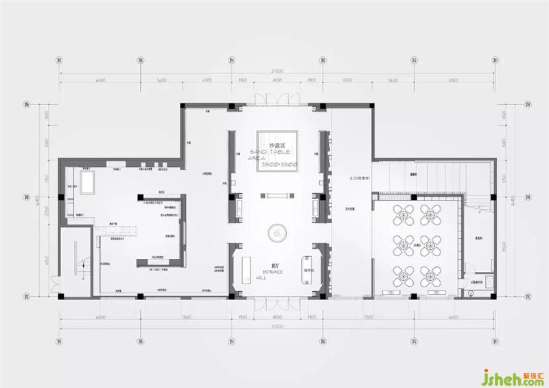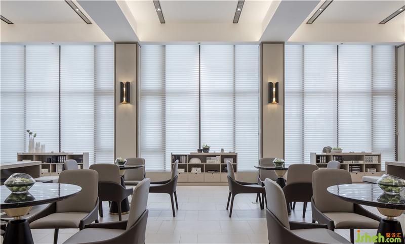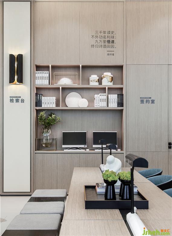 售楼处设计本着实用、舒适的原则,二楼图书馆的空间采用现代设计风格,线条简约硬朗,区域划分整齐有序。浅色系布局,原木色桌面墙体,米色地板,易于缓解眼部疲劳,精神放松。