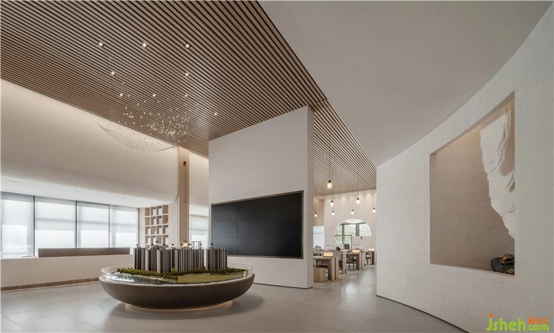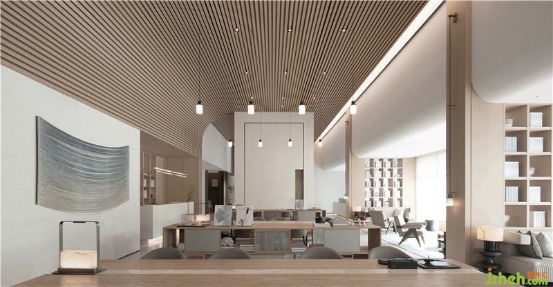 在沙盘区,木格栅船仓贯穿整个天花,构筑极具韵律之感,且伴有变化的光影效果。