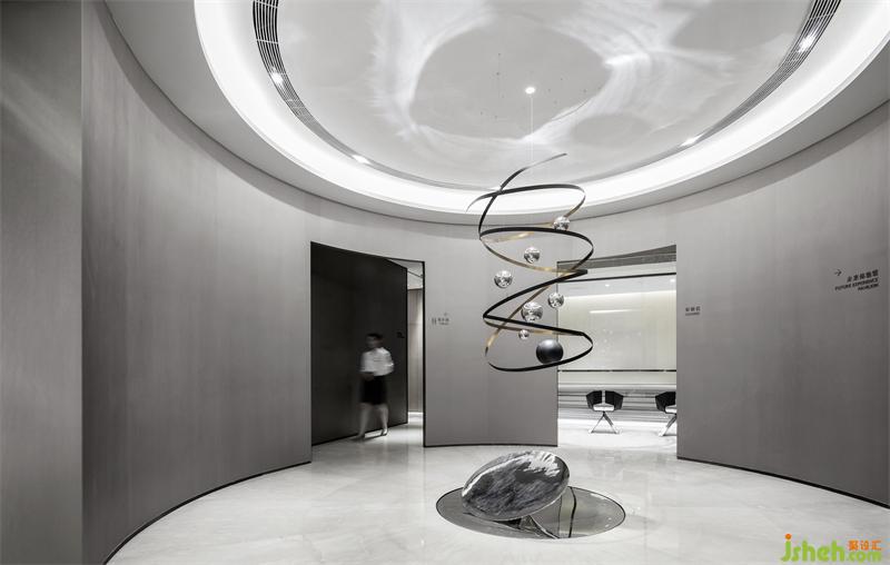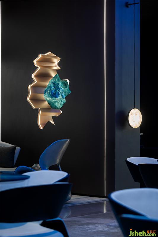 营销中心设计墙体陨石装置艺术来自雕刻家霍奇斯,他选用了抢眼的金属色系和不锈钢材质,岩石的设计参照了星际的梦幻,为冰冷的石块注入一丝丝温度,这样的做法使得这些巨大的岩石无形中被点缀上了神圣的色彩。