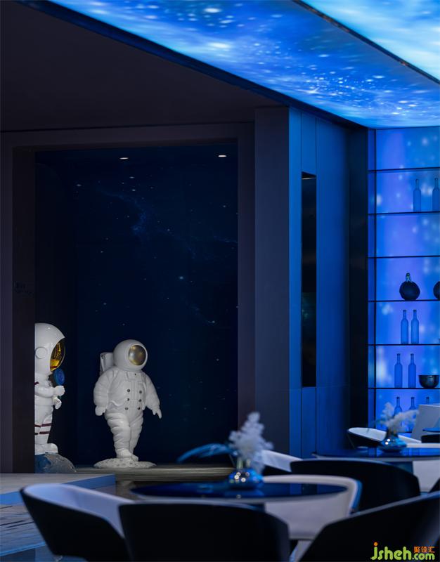 “撞入”墙体的陨石配合墙体光源,成为洽谈区空间里的独特风景。月球灯下身穿宇航服的领航员“走出”,向旅客宣读太空漫游指南。将“意外”布置为艺术,零次方计划的奇技淫巧、匠心妙想,在细微之处尽数体现。