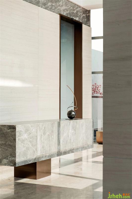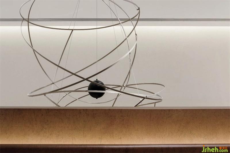 承接硬装纯粹、理性的美学风格,对多元的线条、色彩的升华,表达强烈韵味的活力与激情。前厅接待台面则是透过门洞的几何体浮在光影的体积中,配以线条感栩栩灵动的艺术品点缀。