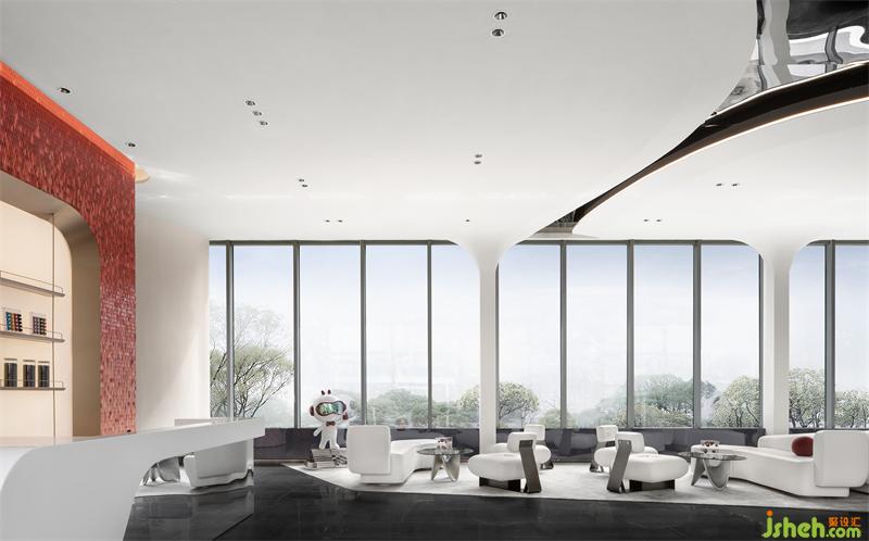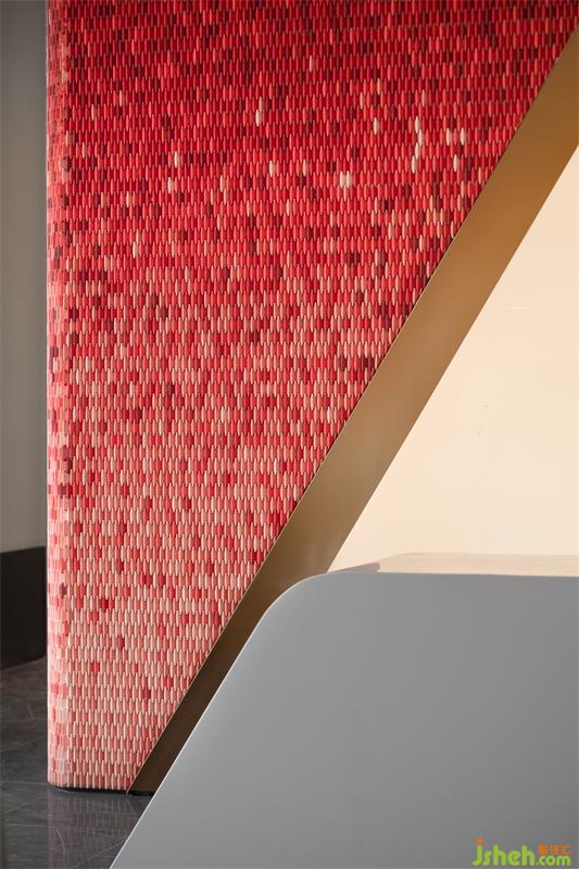 在请上用大面积的红色基调,在纯净利落的白色背景下加入红色点缀内部空间的雏形,细节处辅以不同的新材料,让那抹代表着火热的红色营造视觉焦点。空间天花几条界定空间的弧线创造了视线与动线的延伸并让日光洒于其上而形成时间的印迹。