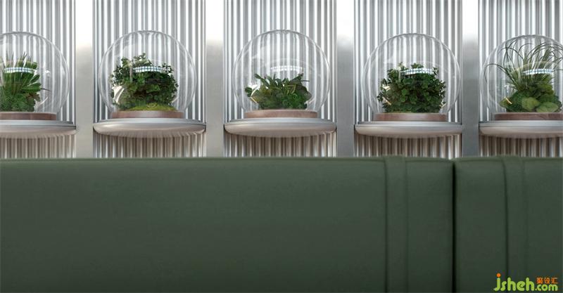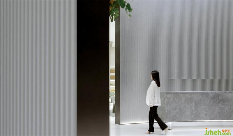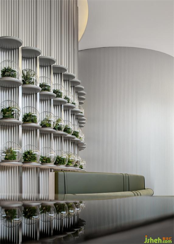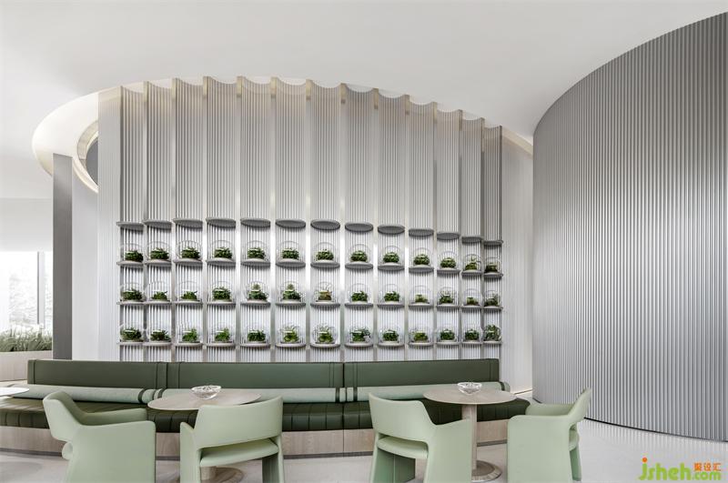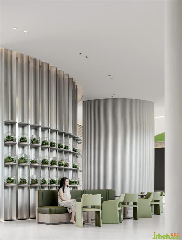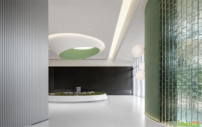 前厅接待区定义了整个项目基调——绿,虔诚而纯朴,是世界上的第一抹颜色,生活体验馆设计以其朴质的外表和浩瀚的神态赋予了人类绝美天堂的意境,滋养着我们的心灵,守护着我们的灵魂。人们跨进金属波浪纹理大门时,一角绿意从视线尽头流淌出来。