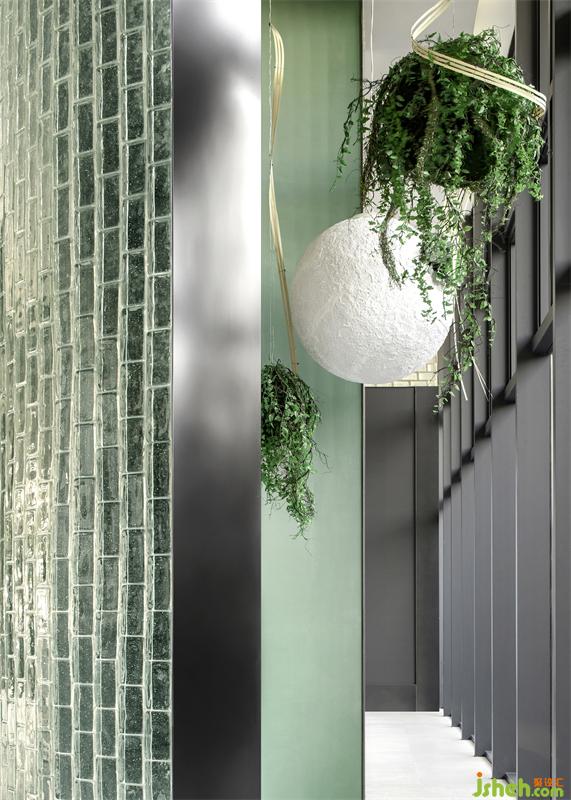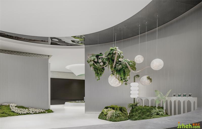 茂密的灌木唤了儿时的记忆,久违的自然画卷一一展开:茂密的热带植物、长满绿苔的石头、忽明忽暗的悬空花束……人们忍不住举起手机,就像李白举起邀月的酒杯,对准空中大大小小的“月亮”;镜头被自然之景吸引,闪烁着绿色的“霸王蝴蝶”。顾客进入接待前厅艺术体验区,惊喜之余,目不暇接,生活体验馆设计就像是坠入了仙境的爱丽丝,入眼皆是奇景,亦真亦幻。