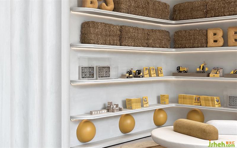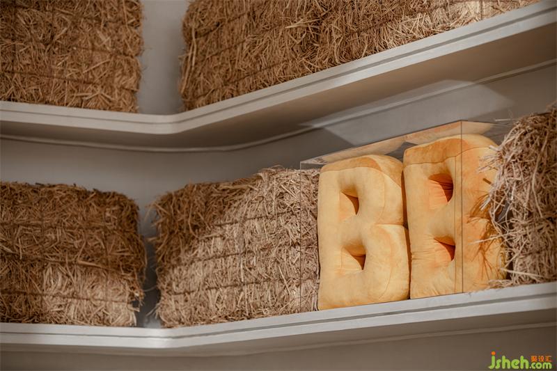 白色“原木桌”浮在涟漪状暖色渐变地毯上,就像漂在池塘水面,生活体验馆设计周围的纯白墙面悬空布置着稻草垛和字母面包,仿佛只要招手,这些大自然的香甜馈赠就即刻到来。谷仓工坊还承担着空间里的互动功能,只要你愿意,就能在此进行食物DIY。