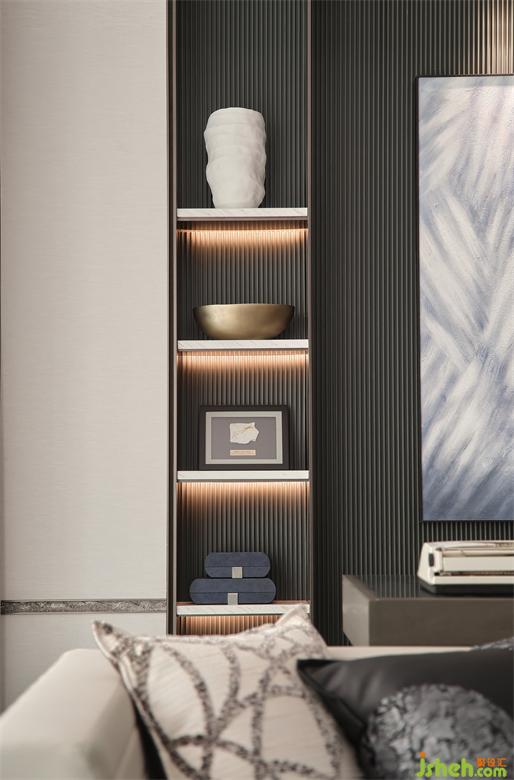空间优雅贯穿于每个角落,艺术的氛围延续至卧室的细节之中。软装物料从色彩、材质、形体上,均结合东方韵味,凸显儒雅气质。低垂的光在镜中掩映,和地面的线光源烘托出安然舒缓的氛围。通过精致生活体验的营造,体现住区未来服务的细致入微。