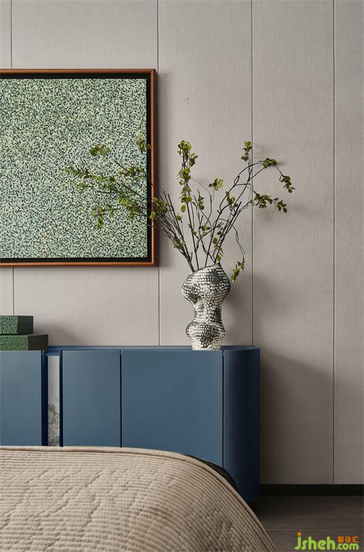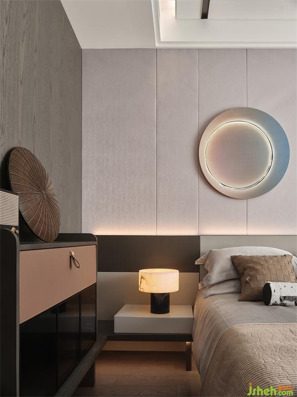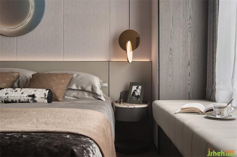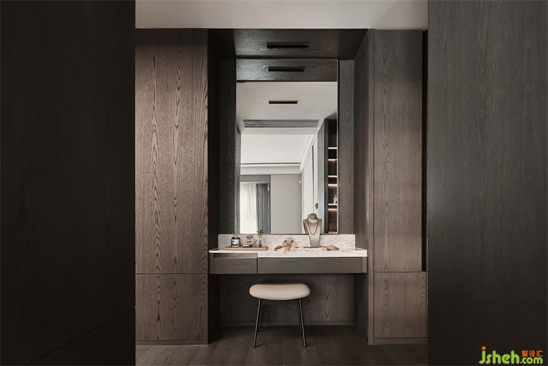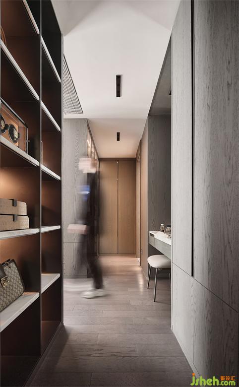 过道式的延伸使我们多了一份暇想,储物格的面和台面用同色纹路肌理相结合,延续了空间的搭配,使整个空间更加协调统一,南京样板房设计打造出空间独有的沉静氛围提升卧室的观感。