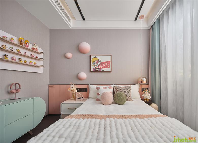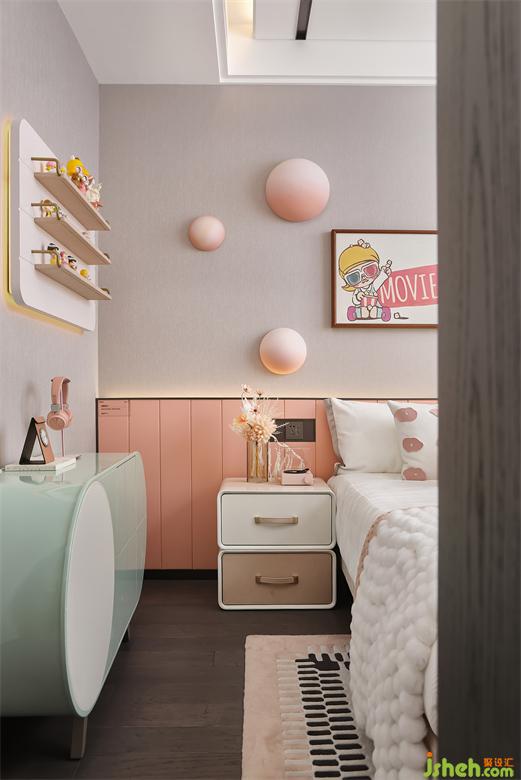 女孩的卧室采用浅粉色为主调,墙壁的油漆肌理隐约展露出挥挥洒洒的设计手法。以此凸显孩童纯真的个性与美好向往。