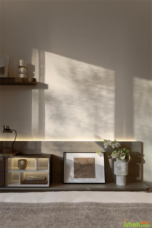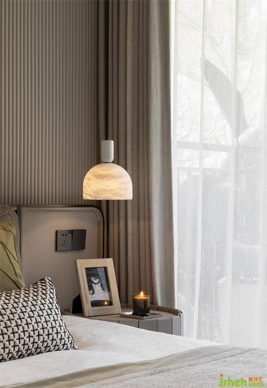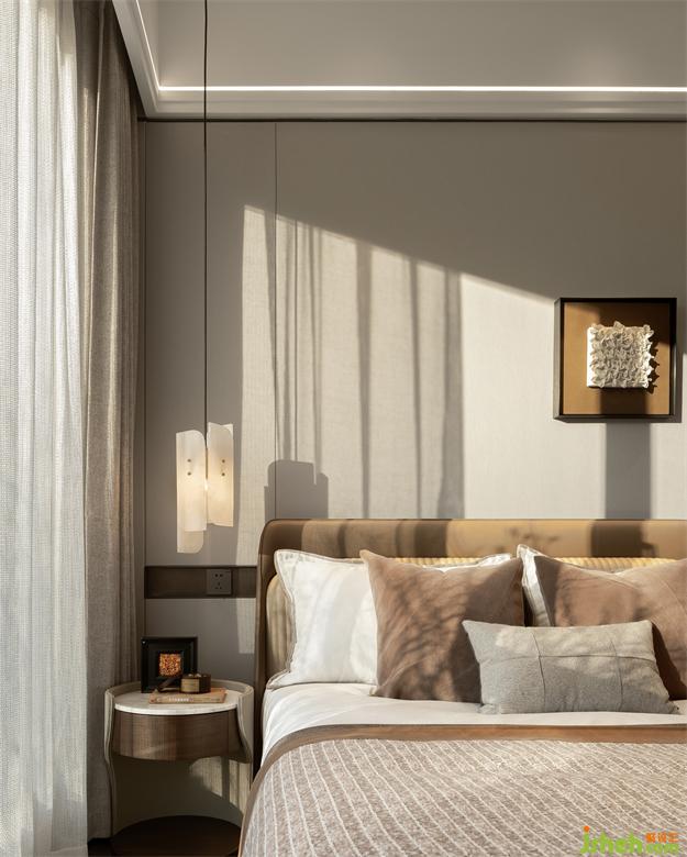 主卧柔和的配色演绎出和缓的空间节奏,赋予空间更多的舒适愉悦之感,简单中散发着一种沉稳安定的情绪感染力。沿着空间的脉络拾步而下,隐与现的艺术转换间,厦门湖畔润璟样板房设计将关怀藏于细节之中,简素之下。