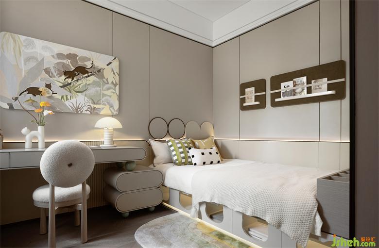 女孩房以猫咪为主题的设计,增加书桌及墙柜功能,打造童趣、与猫玩乐,学习一体的温馨空间。女儿正是处在梦幻般的年纪,清新甜美的糖果色,线条柔和的童话床靠,都在小心翼翼地呵护着孩子的烂漫与童真。