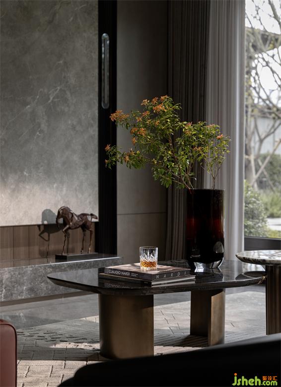 工艺精巧的大理石茶几配以雕刻圆润的棕红木马,为休憩场域注入趣意的同时,亦透出艺术与美学。