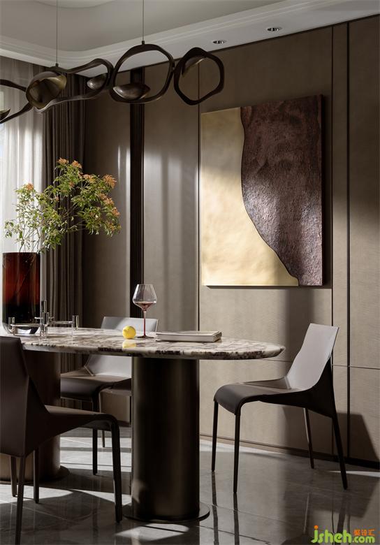 细腻的宝格丽大理石铺陈瑰丽,与金属交织出细致的层次秩序,精致简洁的语汇给人品质感的升华。厦门湖畔润璟样板房设计造型新奇的玻璃灯饰,规则形状的玻璃花瓶,让餐厅的氛围趣味且跳脱,打破了同质化的设计思维所带来的沉闷与无味,构建艺术与功能并行的空间体系。