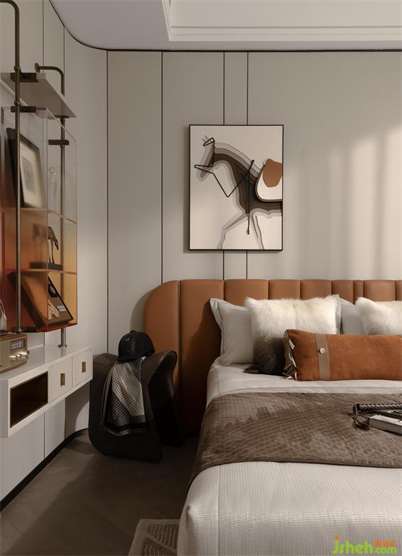 女孩房空间里大量使用了粟壳色和橘色的组合,其色彩气质相当符合爱马仕的色彩搭配原则,贵气十足,而多处运用的皮毛材质,则给人以热情奔放的感觉又兼具了自然之美。空间里放置的马鞭、马术帽,马术装备包,像是行走在艺术的空间里,在讲究的细节中,感悟怒放的生命。