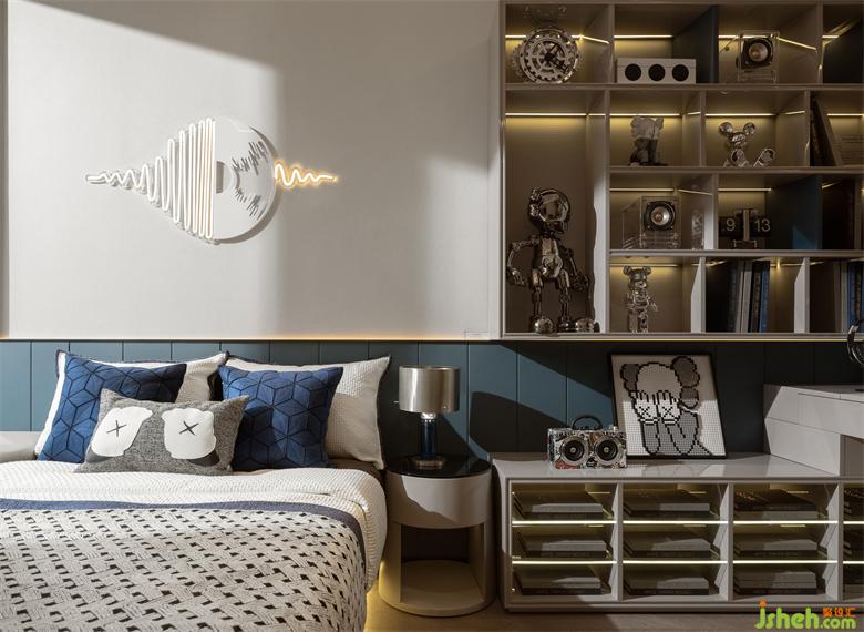 男孩房设置手办墙,演绎收纳和场景化展示设计,潮牌Kaws暴力熊,散发着浓厚的波普艺术气息,深邃的蓝为空间注入理性感,以时尚先锋的个性主张,定制专属年轻人的生活场景,一处充满自由精神及时尚艺术的栖居地。