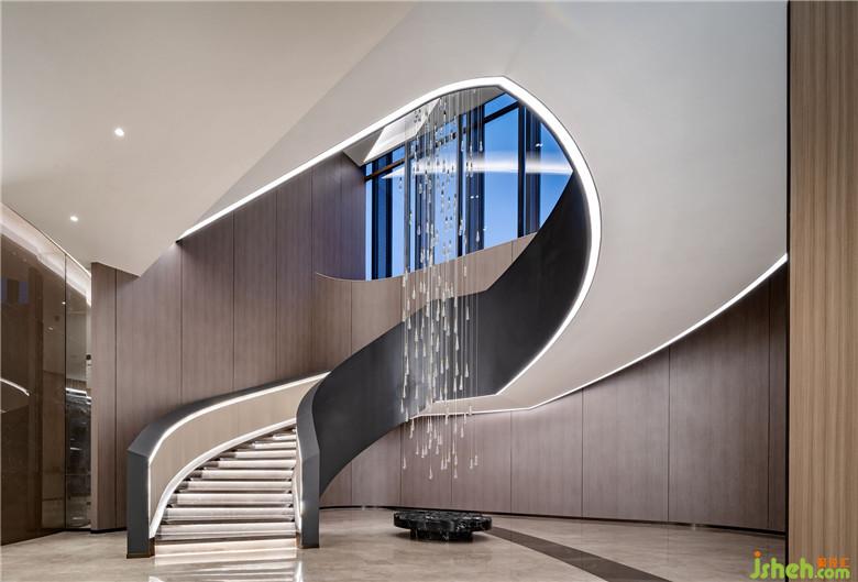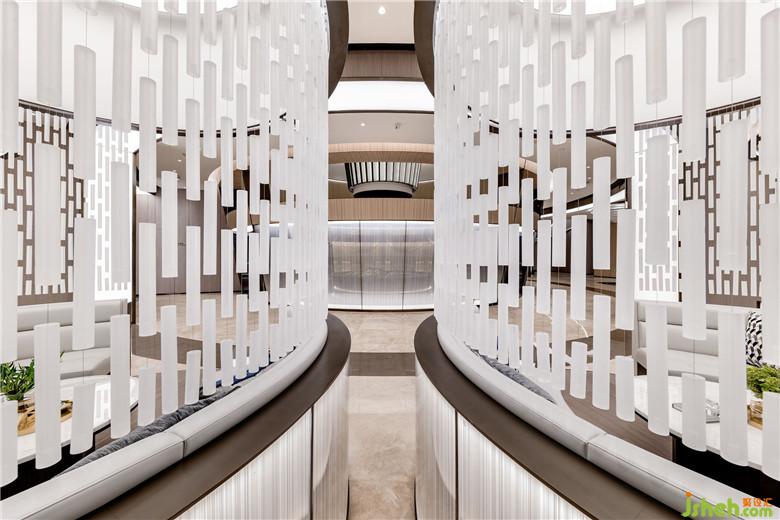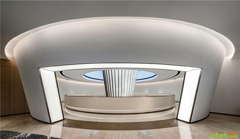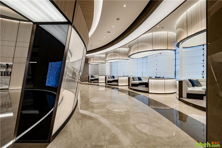 设计师运用了多种不同尺寸的圆形做了整体的室内空间平面布局。从建筑正中心开始往外扩散,正中心是整体空间中最大圆,从正中心的圆开始向外扩散放样出不同尺寸的圆形,塑造出整个室内空间,同时围合出走到和VIP洽谈区等不同功能空间形成了一个完整的立体空间。
