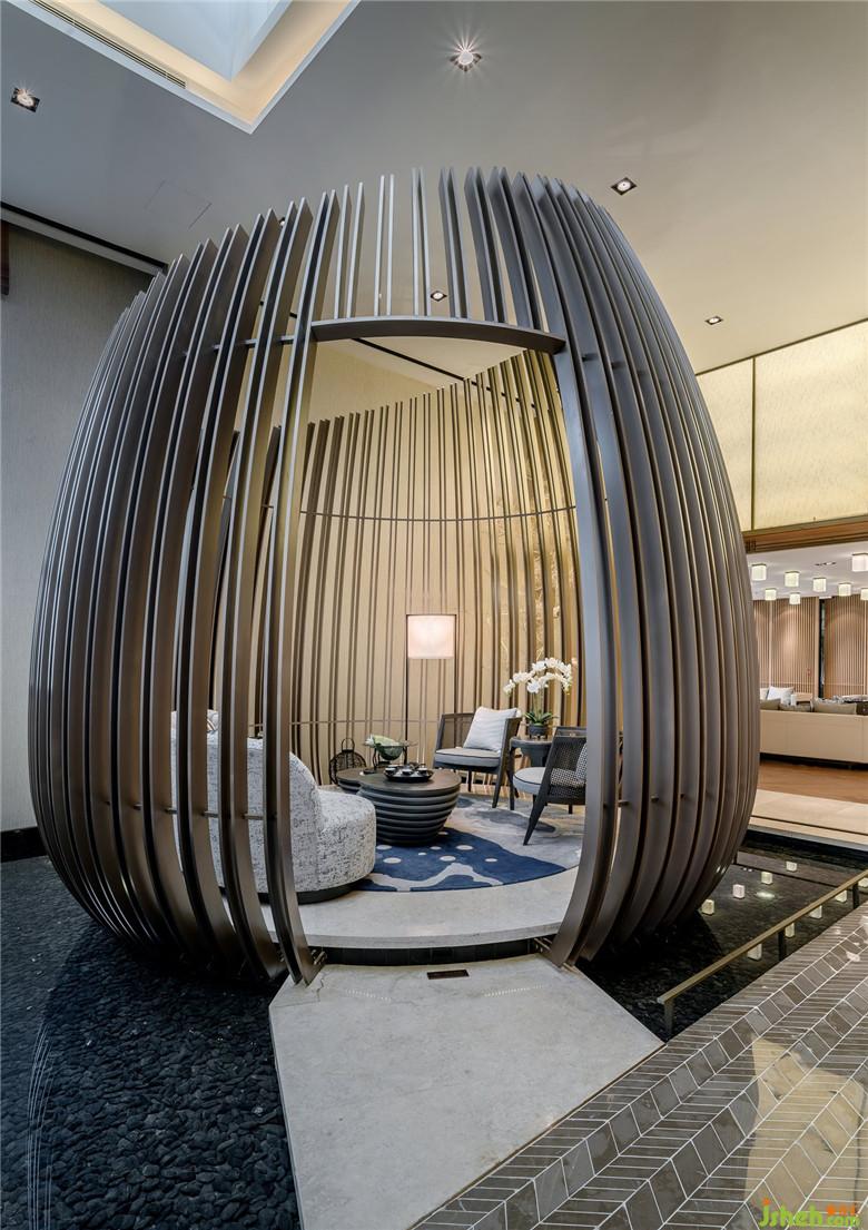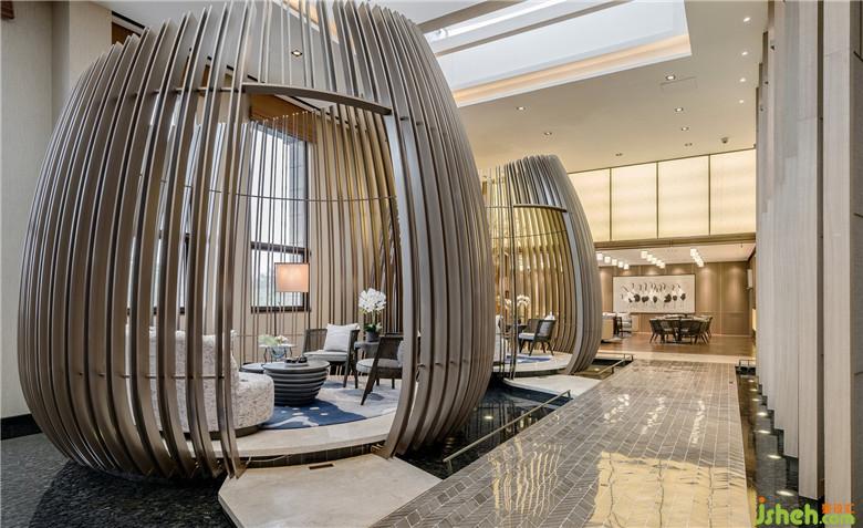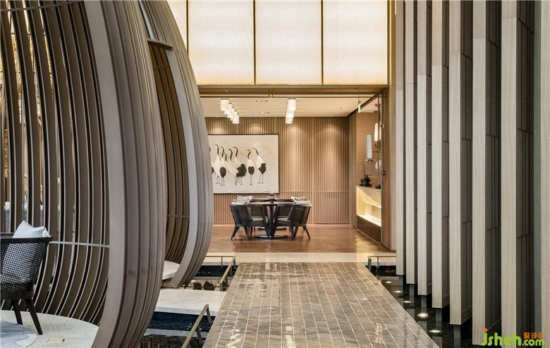 项目紧邻西安曲江遗址公园,依托周边丰富的旅游文化资源和人文传统,恢复性再造曲江南湖、曲江流饮、汉武泉、宜春苑、凤凰池等历史文化景观,再现曲江地区“青林重复,绿水弥漫”的山水人文格局,构建集生态环境重建、观光休闲娱乐、现代商务会展等功能为一体的综合性城市生态和娱乐休闲区。设计师将“东方园林”的概念植入设计,运用自然景观的设计元素,将室外的园林景观融入室内设计。