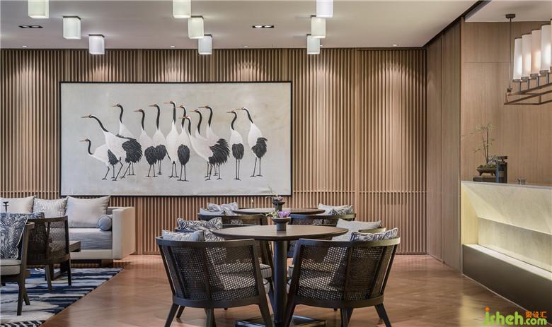 根据地理位置特点,将室外东方园林的设计元素融入室内空间,运用东方园林的小桥、流水、荷叶、梅花树等景致加入空间设计,形成室内造景,表达对自然文化景观的致敬与传承。