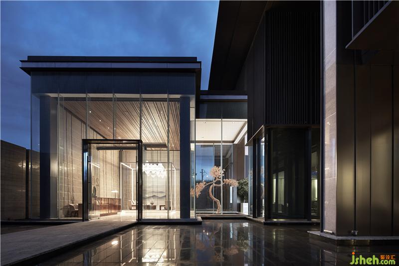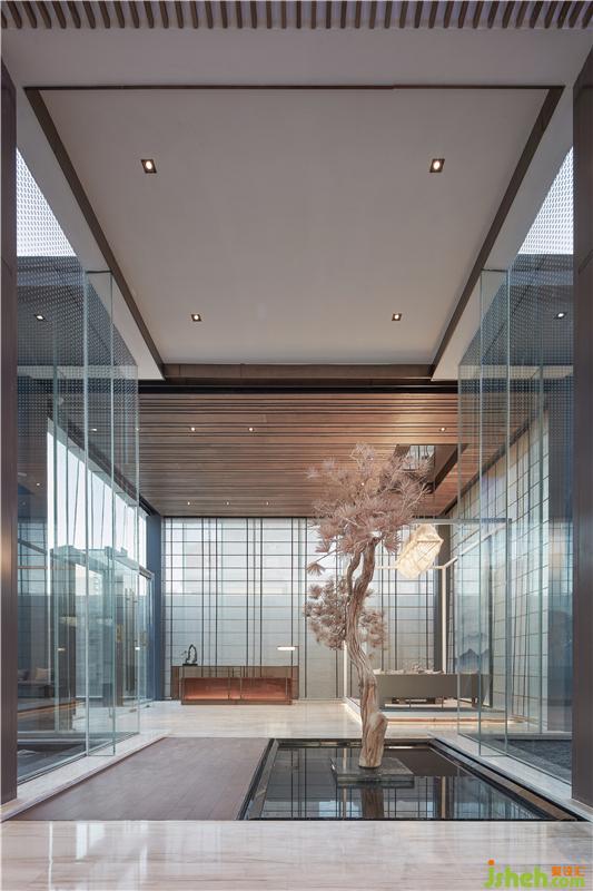 入口接待处茶亭搭配山水纹夹丝玻璃