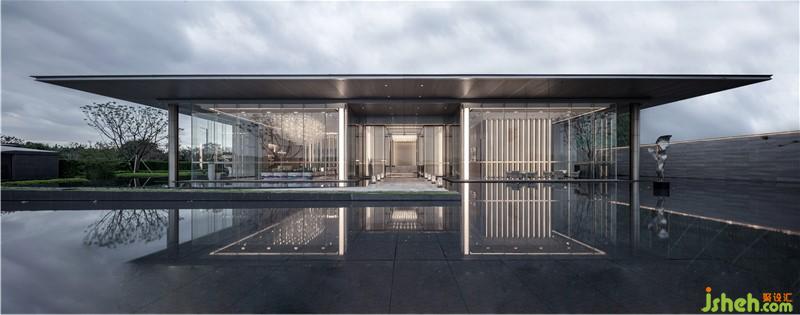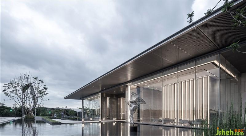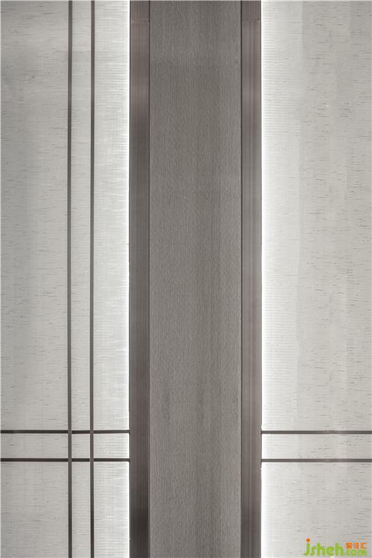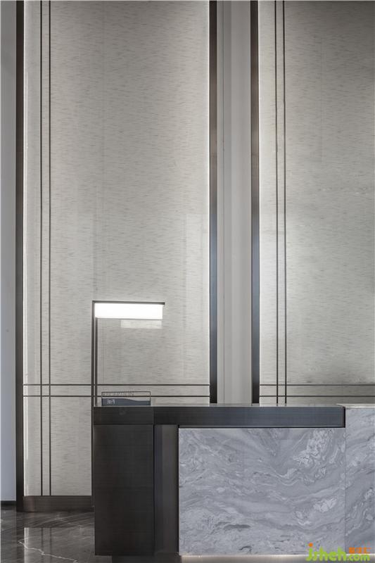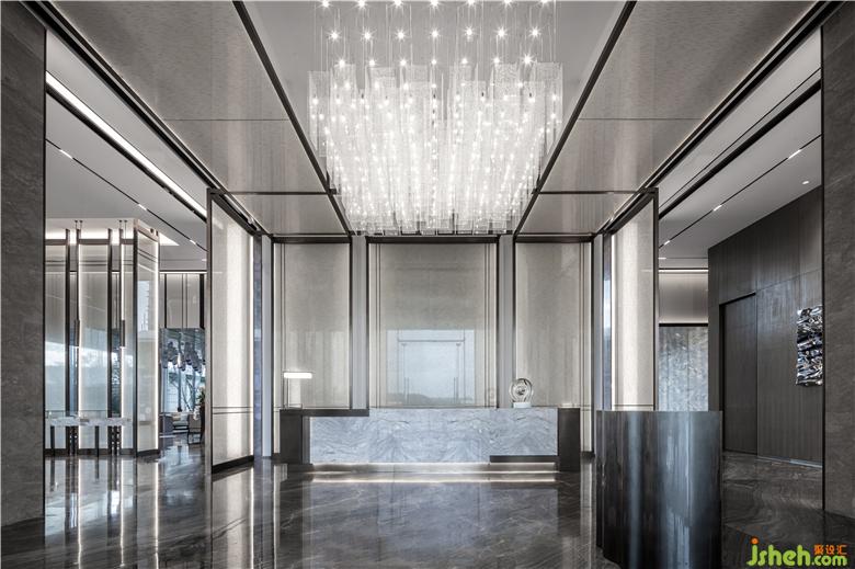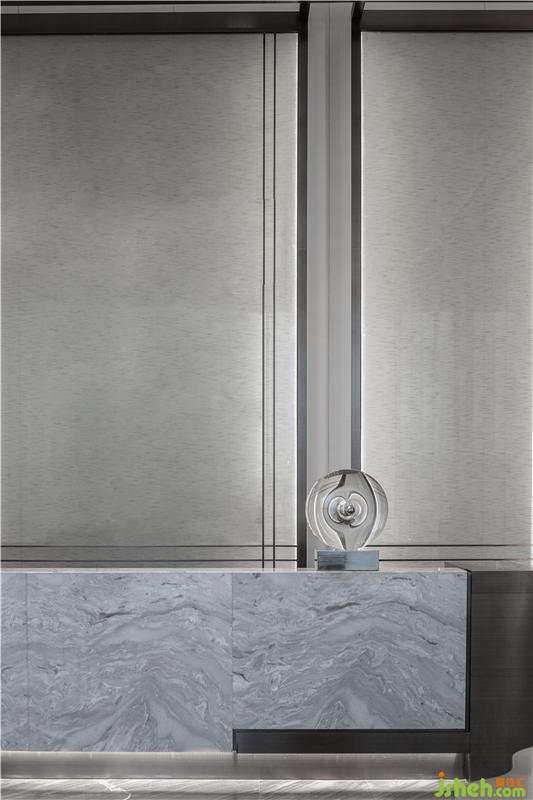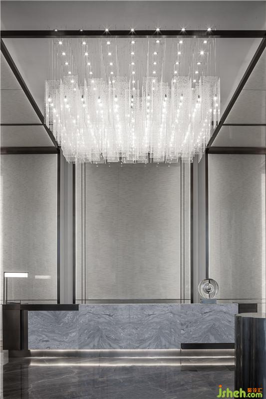 步入前厅,灰色山水纹大理石接待台上方搭配玻璃片不规则排列所形成的装置艺术灯,仿佛冰裂纹瓷器透露着一种清雅的宋韵。空间由于光线的折射而显得熠熠生辉,从而营造艺术展馆的环境氛围。
