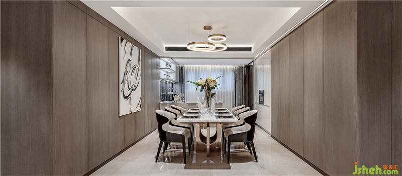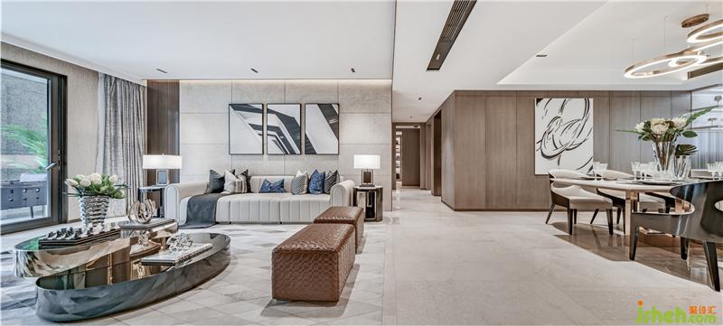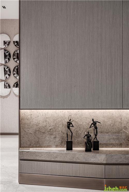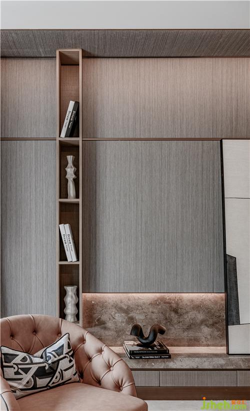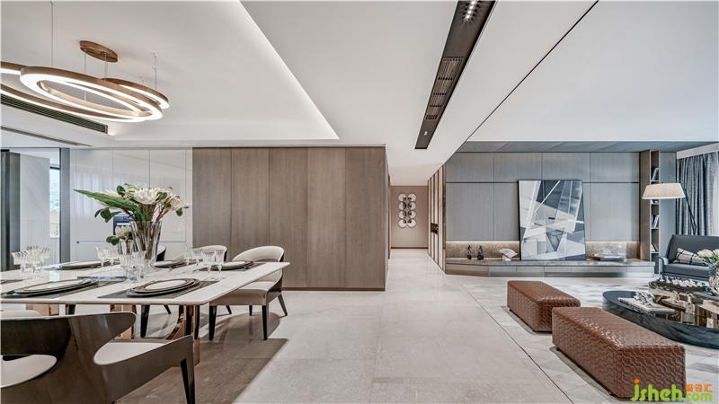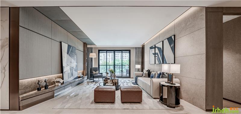 整个空间摈弃纷繁复杂的装饰造型,以大面积的米色勾勒出空间墙面的底色,样板房设计配以素雅的米色石材地面,再辅以深棕色作点缀,在柔和的自然光线下营造出静谧闲适的气质。