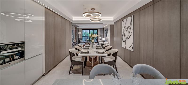 起居室、餐厅、厨房一体化设计,弱化功能区域的界限,增强室内空间的通透感,提升空间的尺度感。一体化的设计强调空间的连续性,空间相通,形成一个较大的视觉纵深,空间层次更丰富,具有更强的流动性。