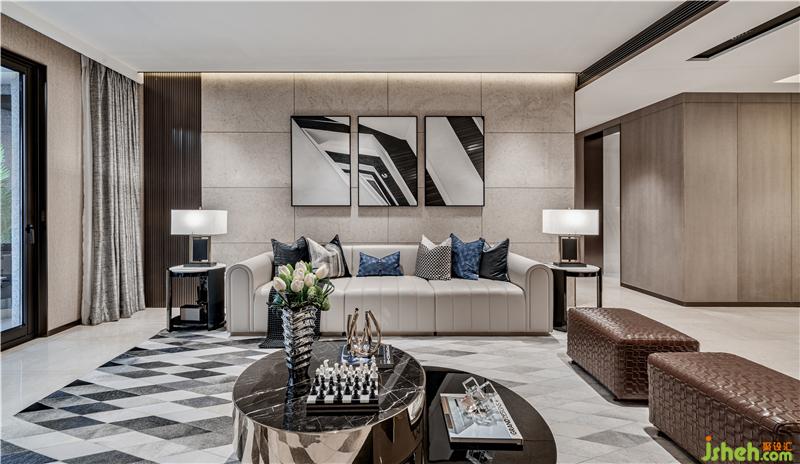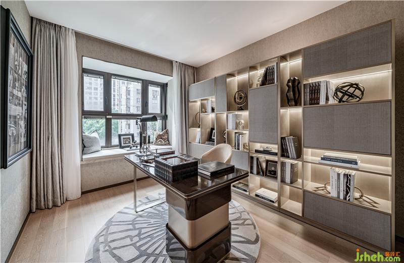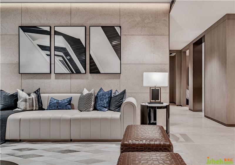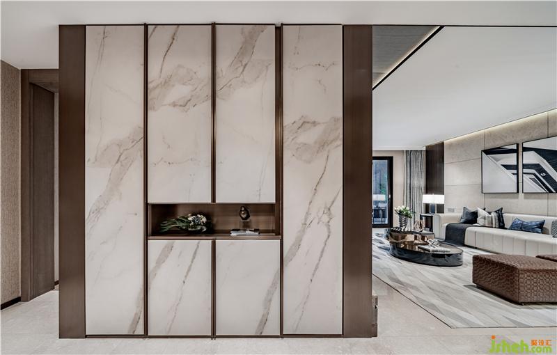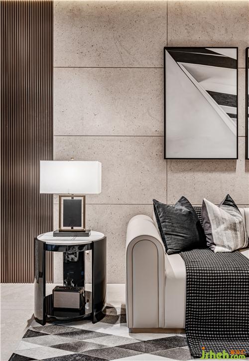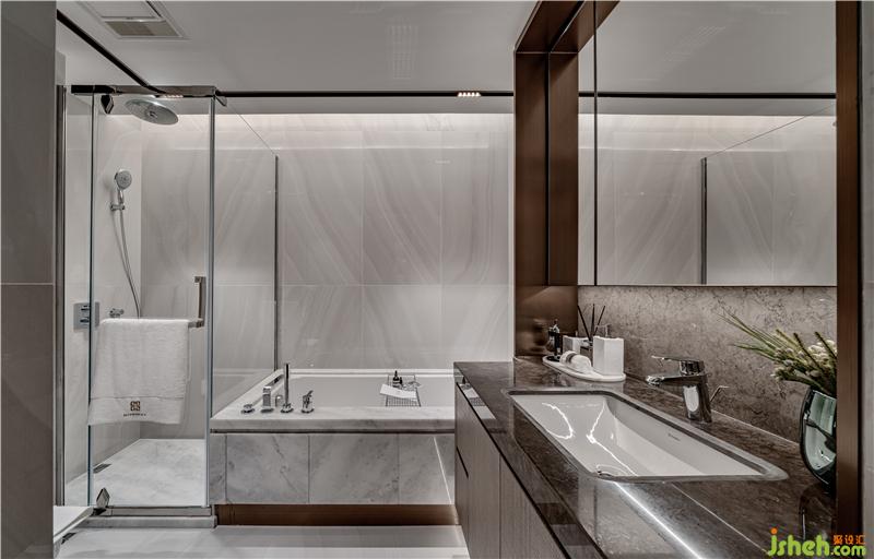 独立卫生间,墙面与地面由同款石材一体而成,深色材质恰到好处的融合与均衡。双台盆样板房设计,合理的规划分割,完美实现功能与美感的结合。