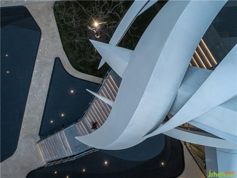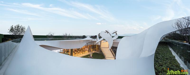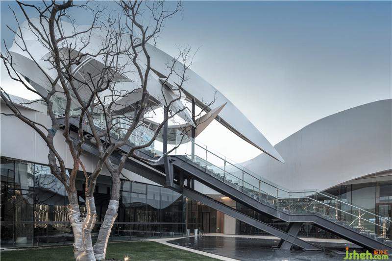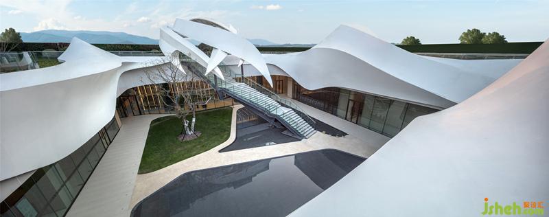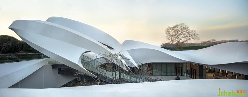 项目基地周围群山环绕,场地区位优越,有紫金山、红山森林动物园等自然景观资源。南京售楼处设计师的设计策略是将地面景观与地下建筑相结合,融入山形的概念,设计了一座地貌式的景观建筑。