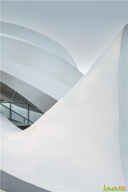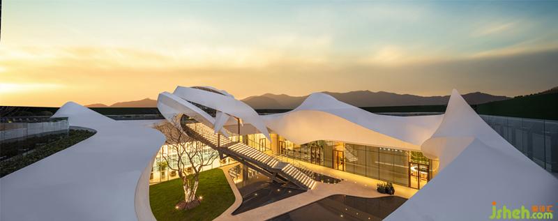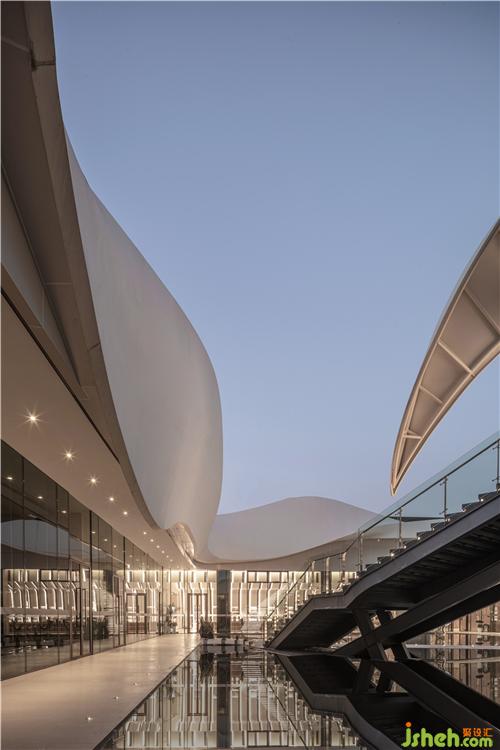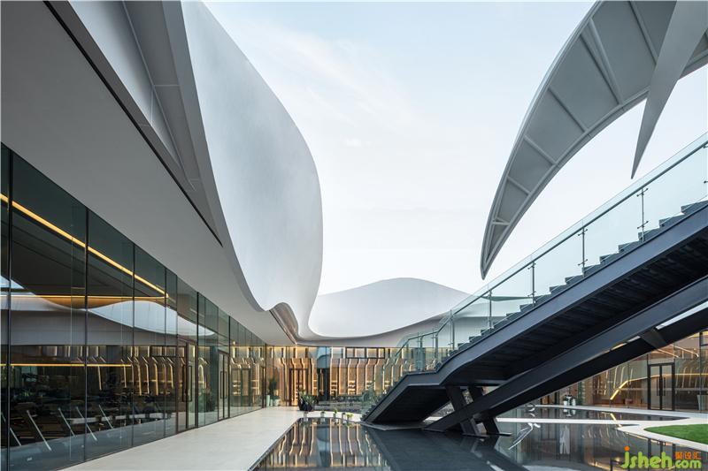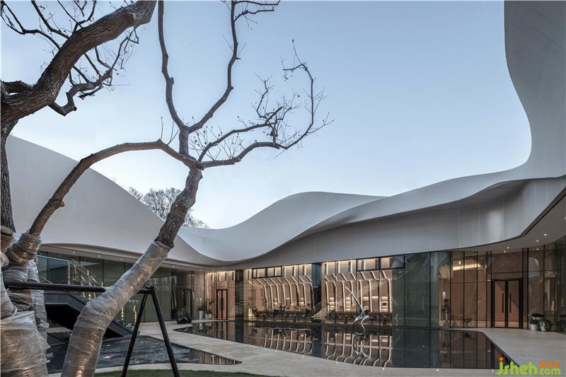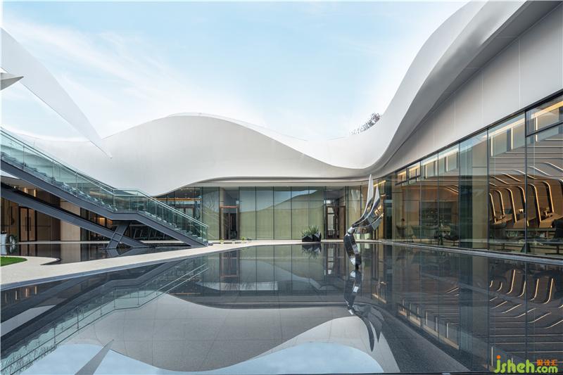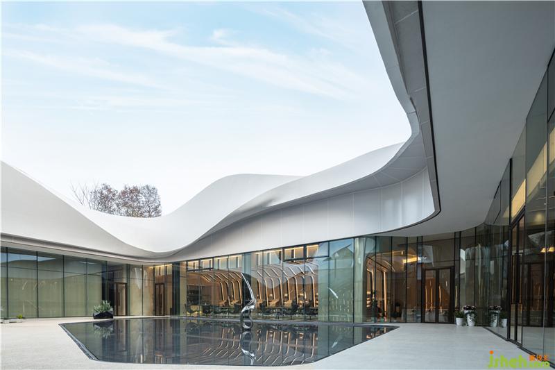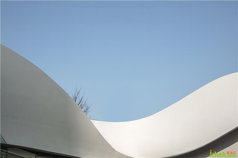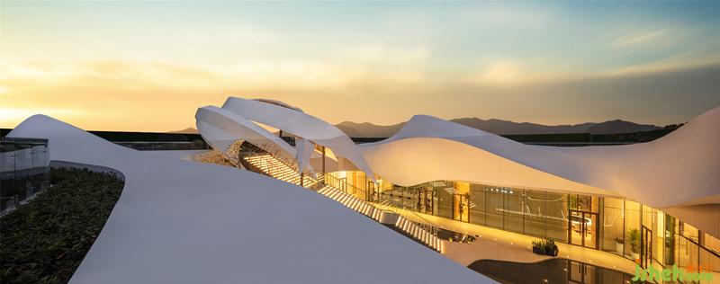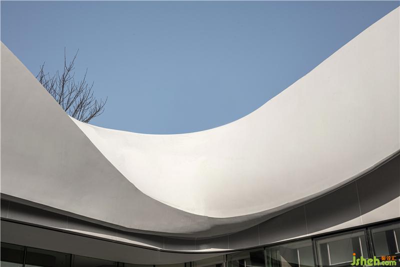 流动的屋面形成自然起伏的山峦形态,线条有机流动,呼应了基地周围山峦的柔美与飘逸南京售楼处设计,尽显灵动。不管人身处庭院中或是地面,步移景异,此起彼伏。