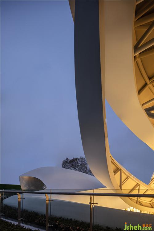 花瓣造型的景观楼梯,宽约10米,长约15米,钢结构造型,钢板拼接覆盖,造型舒展流畅,展现了力学之美。景观构筑物本身不是对符号单纯的模仿,通过结构柱悬挑出来的结构造型和视觉造型的引导,在功能上引导人们进入地下会所空间。