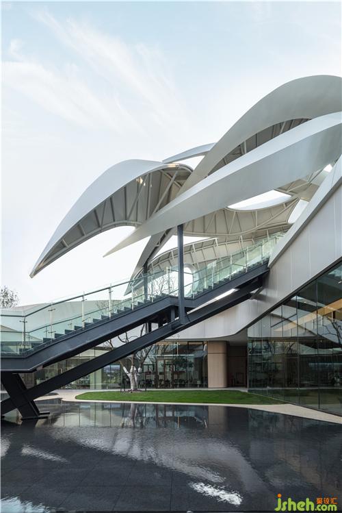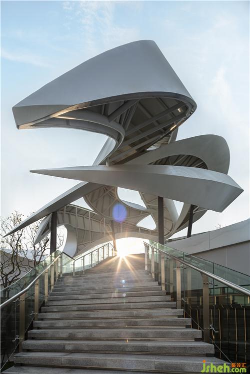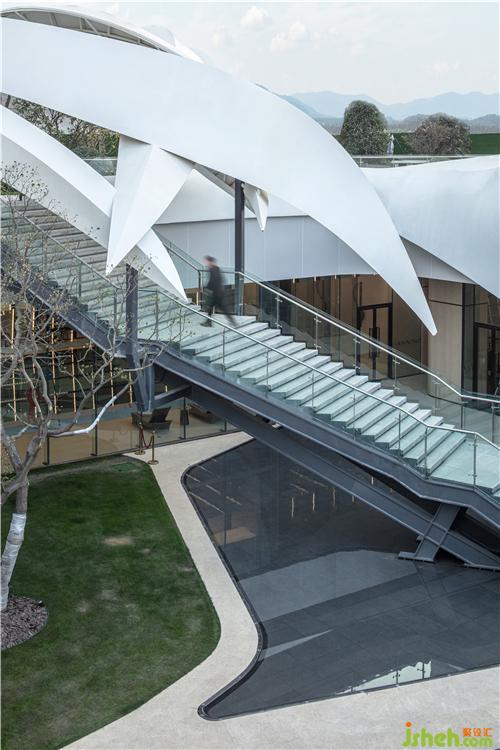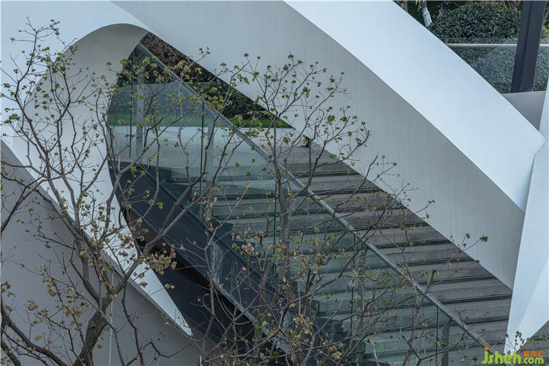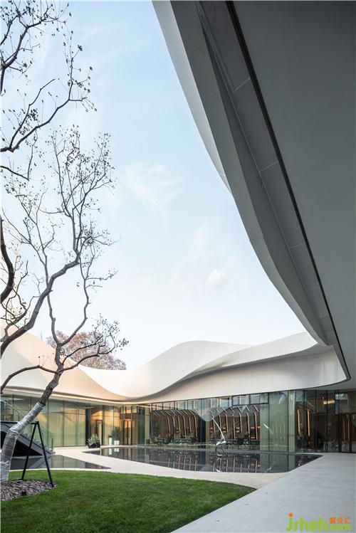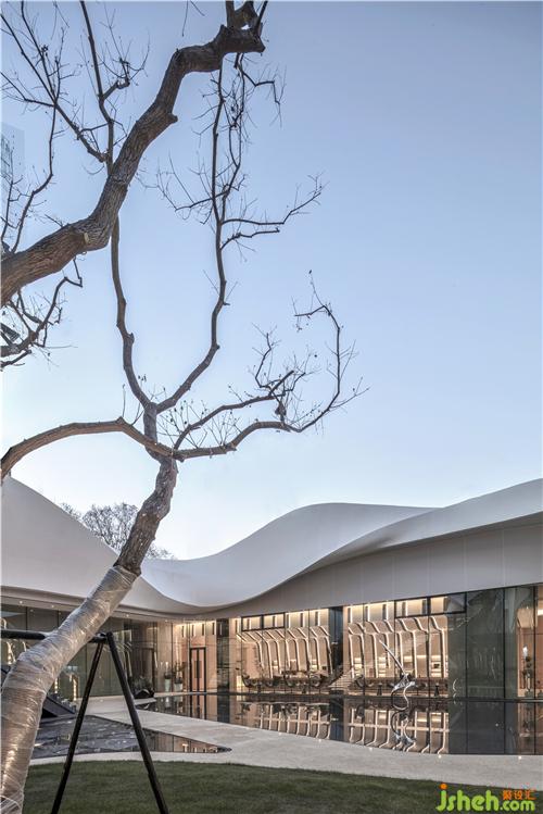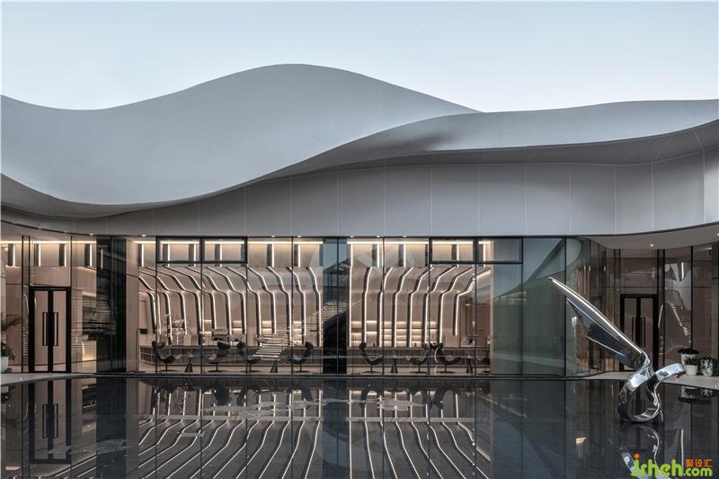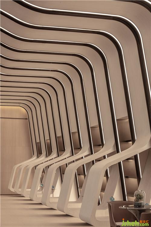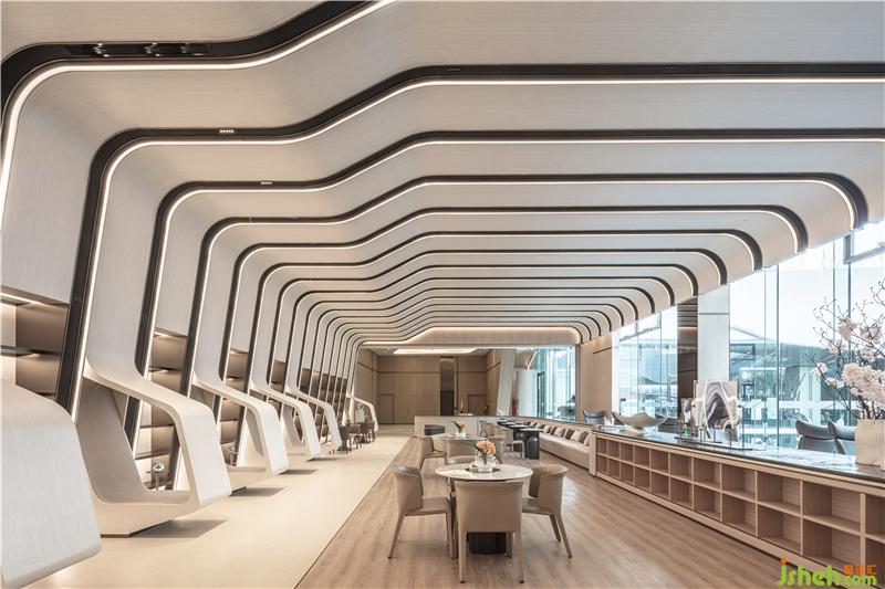 简洁的落地玻璃将自然光引入室内,并让外部独特的景观与室内空间产生对话关系,模糊了室内外的界限南京售楼处设计。室内曲线型的联排光带,将天花和墙面融合而成一整片光之幕墙,曲线造型增添了空间的活力和律动。